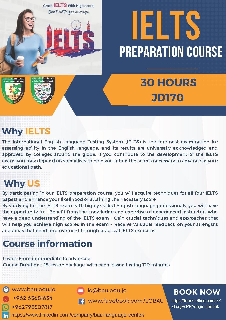 يسر مركز اللغات في جامعة البلقاء التطبيقية الإعلان عن بدء التسجيل في الدورة التحضيرية لامتحان الايلتس بواقع 30 ساعة