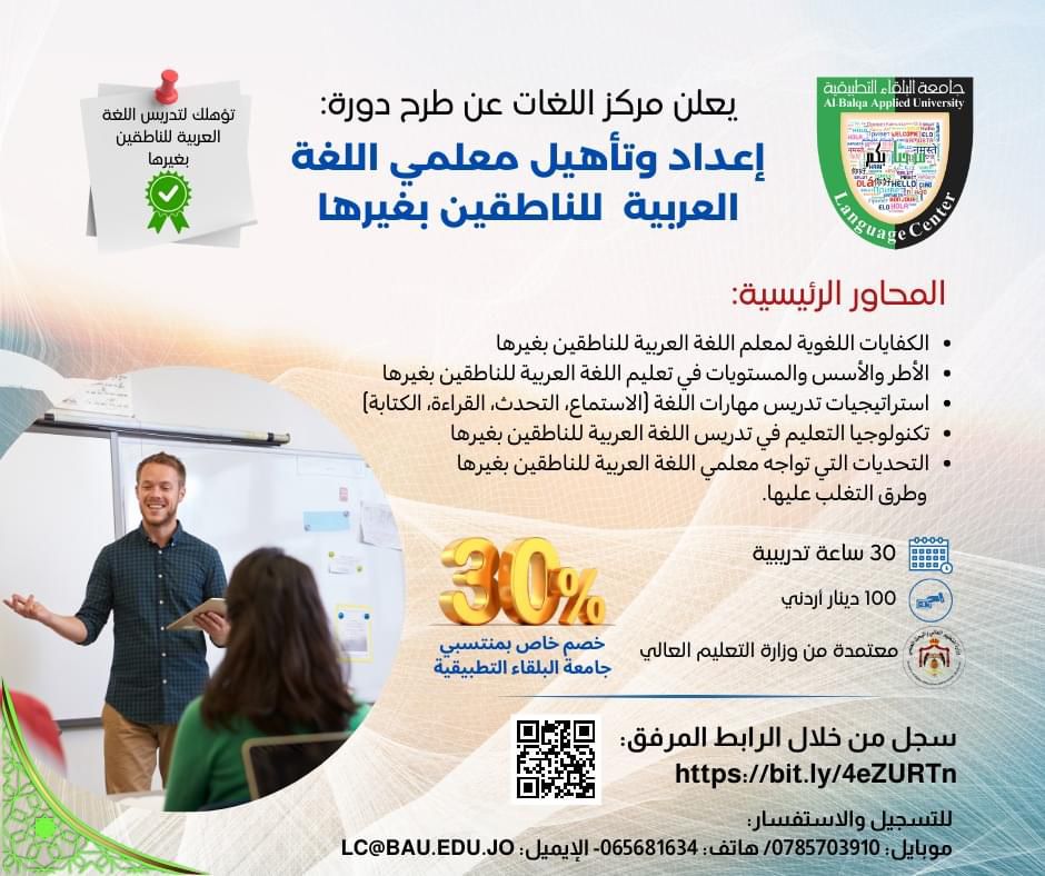 يسر مركز اللغات في جامعة البلقاء التطبيقية الإعلان عن تمديد التسجيل في الدورة التأهيلية التطبيقية
