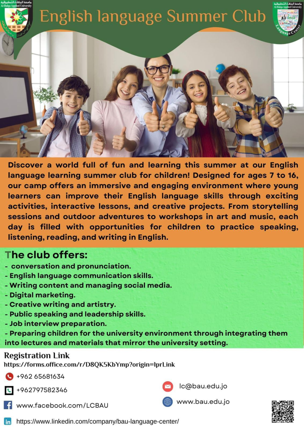 نادي اللغة الإنجليزية الصيفي للصغار هو المكان المثالي لأطفالك لقضاء عطلتهم الصيفية بشكل ممتع ومفيد! انضموا إلينا لبرنامج مليء بالأنشطة التفاعلية، مثل الألعاب اللغوية، القصص الممتعة، والأغاني التعليمية، التي تساعد على تطوير مهارات اللغة الإنجليزية لدى الأطفال بطريقة مرحة ومشجعة. نقدم بيئة آمنة ومليئة بالإبداع حيث يمكن للأطفال التعرف على أصدقاء جدد واكتساب ثقة أكبر في التحدث بالإنجليزية. دع أطفالك يعيشون تجربة صيفية لا تُنسى مع نادي اللغة الإنجليزية الصيفي!