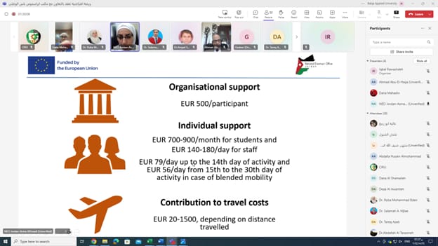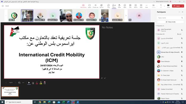تأتي هذه الوشة التعريفية ضمن سلسلة الورش التي تنوي وحدة التعاون والعلاقات الدولية عقدها للتعريف ببرنامج ايراشموس+. وقد شارك في الورشة الافتراضية عددًا من أعضاء الهيئة التدريسية والإدارية في الجامعة، بالإضافة إلى فريق وحدة التعاون والعلاقات الدولية.