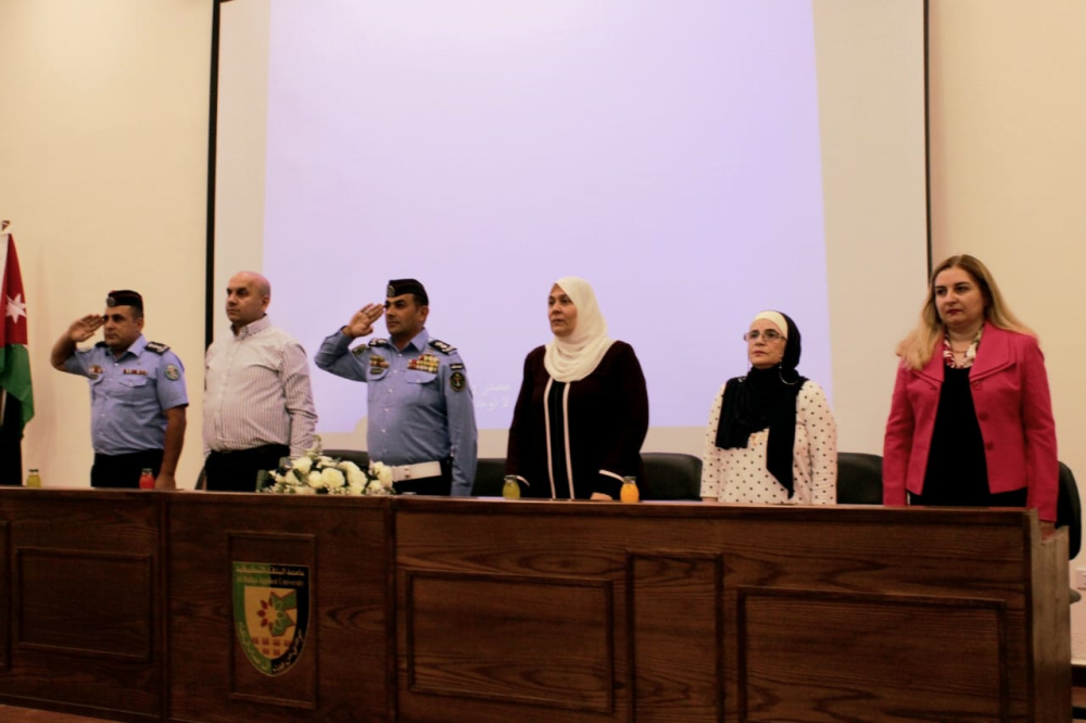 حيث بدأت الجلسة الحوارية بالسلام الملكي فكلمة لنائب العميد لشؤون الدراسات العليا والبحث العلمي ثمنت فيها الجهود المشتركة بين أسرة الكلية ومديرية الإعلام والشرطة المجتمعية من خلال سلسلة المحاضرات والندوات التي تنظمها الشرطة المجتمعية والتي تستهدف فئة الشباب لغاية توعيتهم في كافة المجالات الأمنية.
