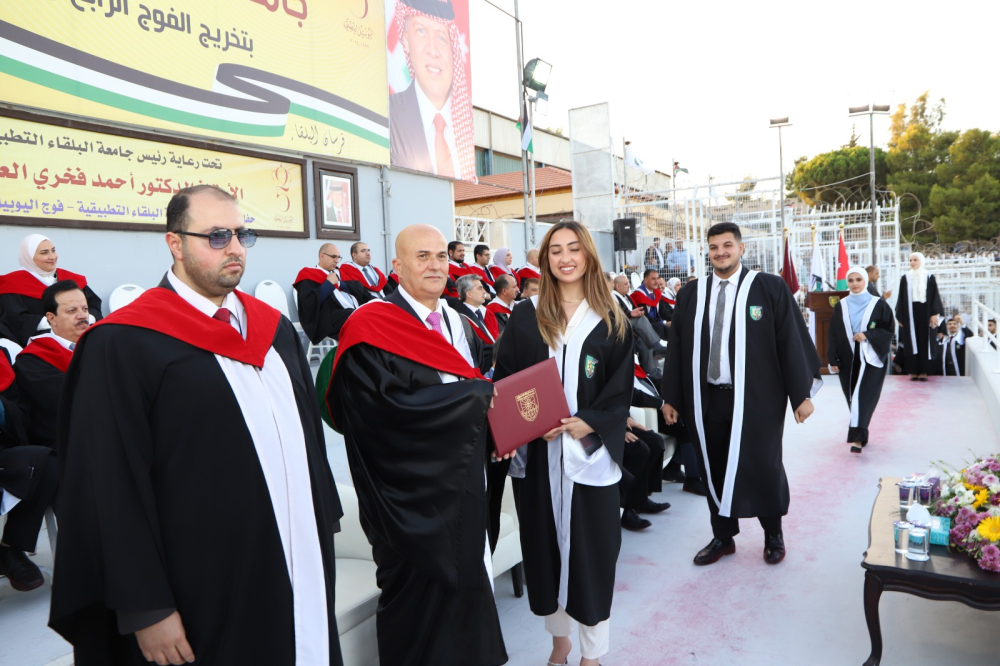 وقدم عمداء الكليات المصلح والزعبي والنعيمات التهاني والتبريكات بإسم رئيس الجامعة وأسرتها الى الطلبة الخريجين وذويهم معبرين عن اعتزاز الجامعة بجميع طلبتها ، مؤكدين ان البلقاء التطبيقية نشأت لتكون صرحا علمياً متميزاً وشريكا فاعلاً بالإرتقاء بنوعية التعليم ، دأبت وثابرت للوصول إلى المكانة المرموقة التي وصلت إليها وبنت سمعتها وتميزها من خلال توفير البيئة الأكاديمية الملائمة للهيئة التدريسية والطلبة والتي انعكست على جودة التعليم والمتابعة الحثيثة لأحدث المستجدات في التعليم والبحث العلمي ، وبما يتلائم مع التطورات العالمية لتلبية إحتياجات المجتمع المحلي والإقليمي والدولي ، متمنين لجميع الطلبة دوام التوفيق والنجاح في حياتهم العلمية والعملية .