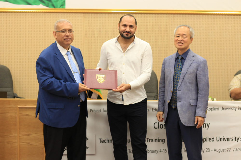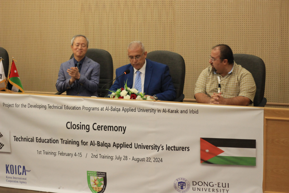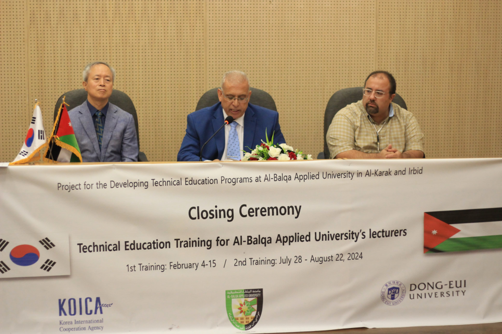 حيث نقل مندوب رئيس الجامعة عميد كلية اربد الجامعية خلال كلمته في حفل الختام، تحيات رئيس الجامعة الأستاذ الدكتور أحمد فخري العجلوني للمشاركين والقائمين على هذه الدورة والتي تهدف إلى تطوير برامج التعليم التقني ورفع كفاءة وقدرات الهيئات التدريسية وتزويدهم بالمهارات اللازمة لمواكبة التطور التكنولوجي ، مؤكداً على أن هذا الانجاز يأتي تجسيداً لرؤية الجامعة المستمدة من توجيهات جلالة الملك عبدالله الثاني حفظه الله وهي سياسة انتهجتها جامعة البلقاء التطبيقية في تشجيع وتطوير التعليم التقني والمهني، وتعزيز الشراكة مع المجتمع المحلي معبراً عن اعتزاز الجامعة والكلية بالعلاقات التي تربطهم بوكالة (KOICA) والجامعات والمعاهد الكورية.