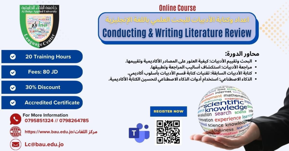 * مدة الدورة: 20 ساعة تدريبية. * الرسوم: 80 دينار (استفد من خصم 30% خاص بمنتسبي جامعة البلقاء التطبيقية). * الشهادة:  معتمدة من وزارة التعليم العالي والبحث العلمي. * التدريب:  عن بُعد عبر تطبيق:  Microsoft Teams.