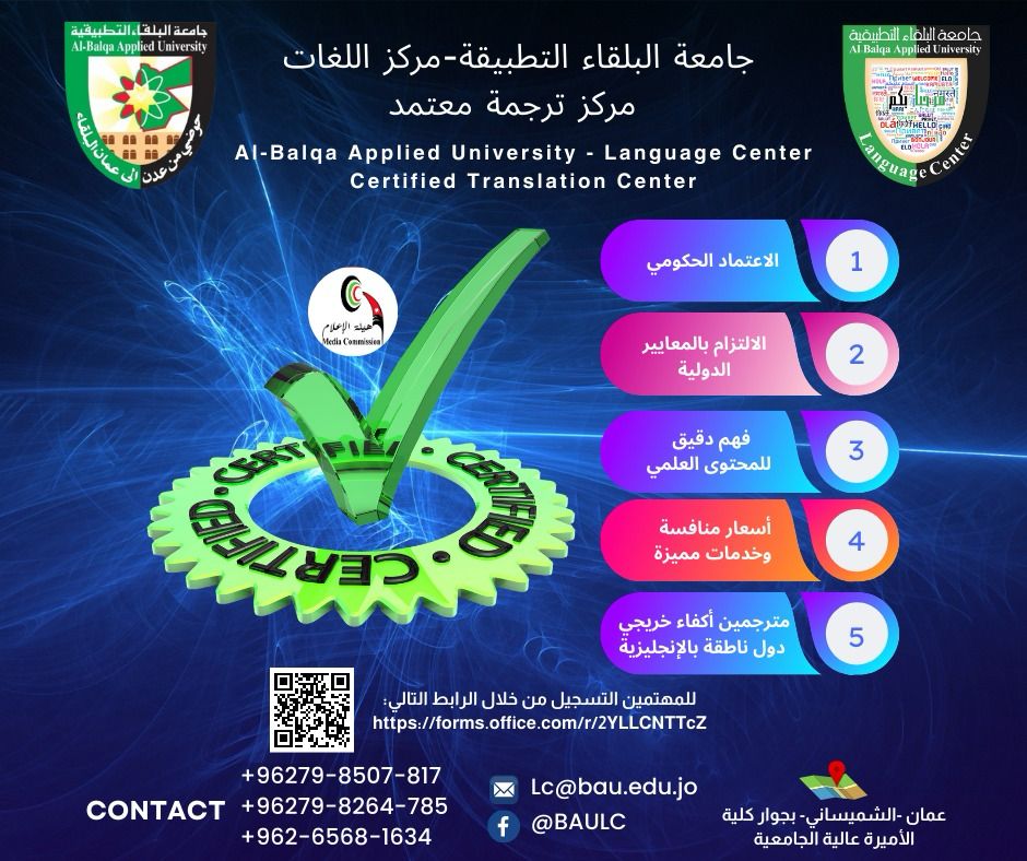 يسعدنا أن نعلن أن مركز اللغات في جامعة البلقاء التطبيقية أصبح مركزًا معتمدًا ومرخصًا لتقديم خدمات الترجمة بجميع أنواعها بما فيها الترجمة القانونية وترجمة الشهادات الجامعية والوثائق الحكومية، بموجب حصوله على ترخيص (ترجمة معتمدة) من هيئة الإعلام، وفقًا للمادة (17/ب) من قانون المطبوعات والنشر رقم (8) لسنة 1998 وتعديلاته، والمادة (9) من نظام ترخيص مؤسسات النشر والإعلان رقم (65) لسنة 2017.