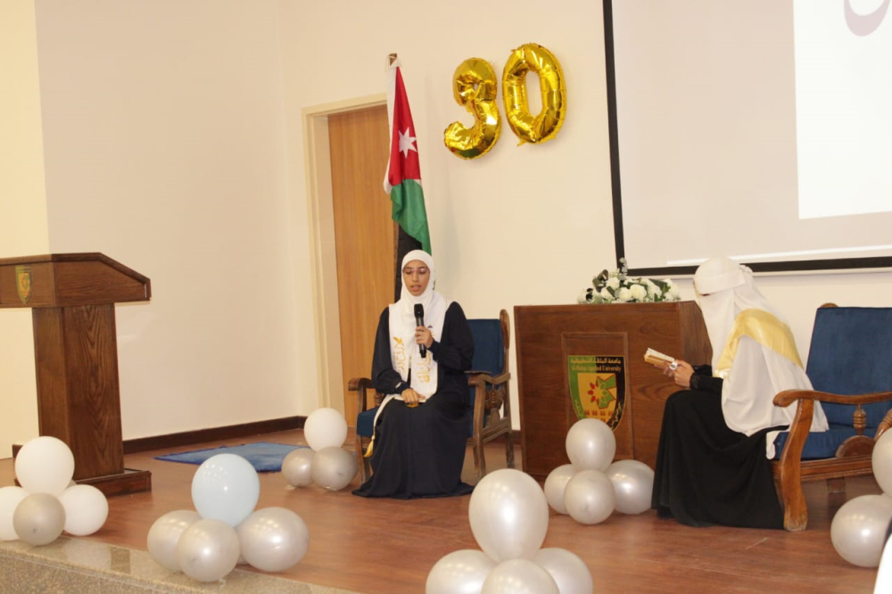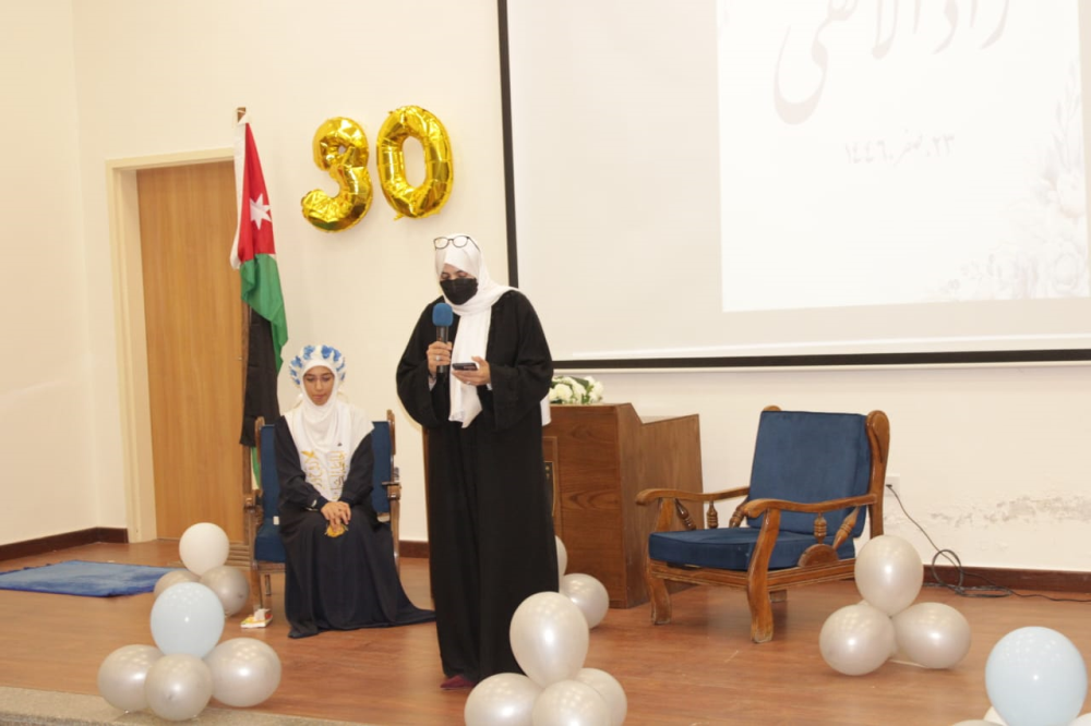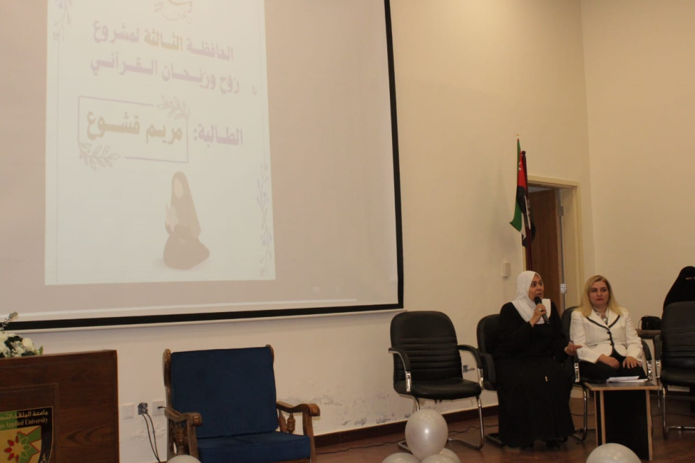 ثم استضافت الدكتورة المجالي الطالبة الحافظة للقرآن الكريم مريم قشوع تخصص بكالوريوس تربية خاصة موهبة وابداع/ كلية الاميرة عالية الجامعية ، لتستفيد الطالبات من تجربتها في حفظ كتاب الله وكيف وفقت بين الحفظ والدراسة واثره في حياتها العلمية والعملية والبركة التي أنزلها الله تعالى عليها وتيسيره عز وجل لتداوم على الحفظ وشعورها عند وصولها لحفظ القران الكريم كاملاً