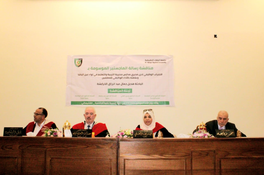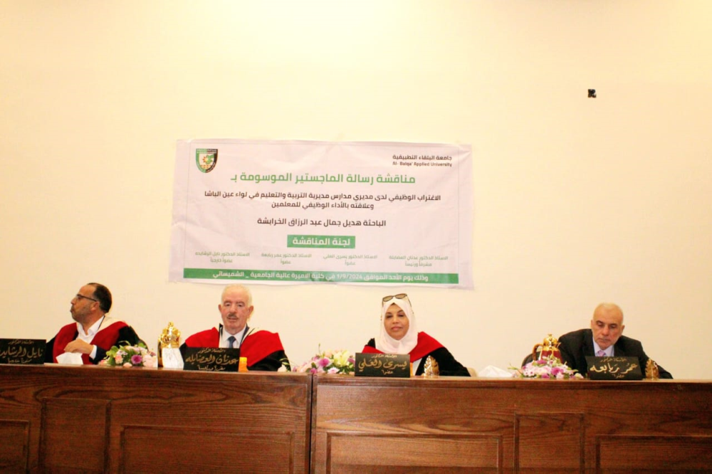 تم في مساء يوم الاحد الموافق 1/9/2024 ، مناقشة رسالة ماجستير للطالبة هديل جمال الخرابشة تخصص الإدارة التربوية قسم العلوم التربوية والموسومة بـ :