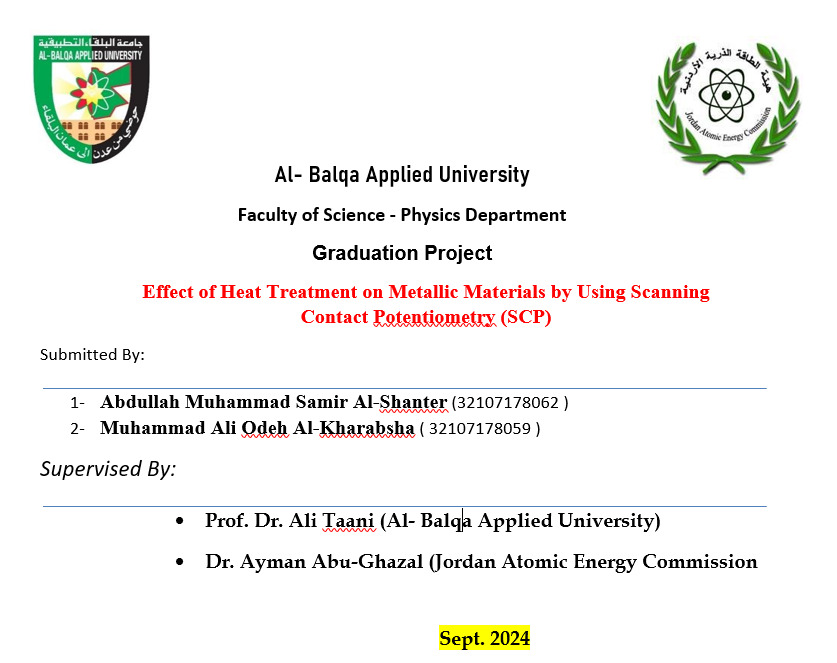 تم يوم الإثنين مناقشة مشروع تخرج الطالبين محمد الخرابشة وعبدالله الشنتير من قسم الفيزياء – كلية العلوم بجامعة البلقاء التطبيقية، بالتعاون مع هيئة الطاقة الذرية الأردنية، وتحت إشراف مشترك من الأستاذ الدكتور علي الطعاني، رئيس قسم الفيزياء، والدكتور الباحث أيمن أبو غزال. وكان عنوان المشروع: "تأثير المعالجة الحرارية على المواد المعدنية باستخدام تقنية قياس الجهد بالتماس المسحي (SCP)" (Effect of Heat Treatment on Metallic Materials by Using Scanning Contact Potentiometry (SCP)).