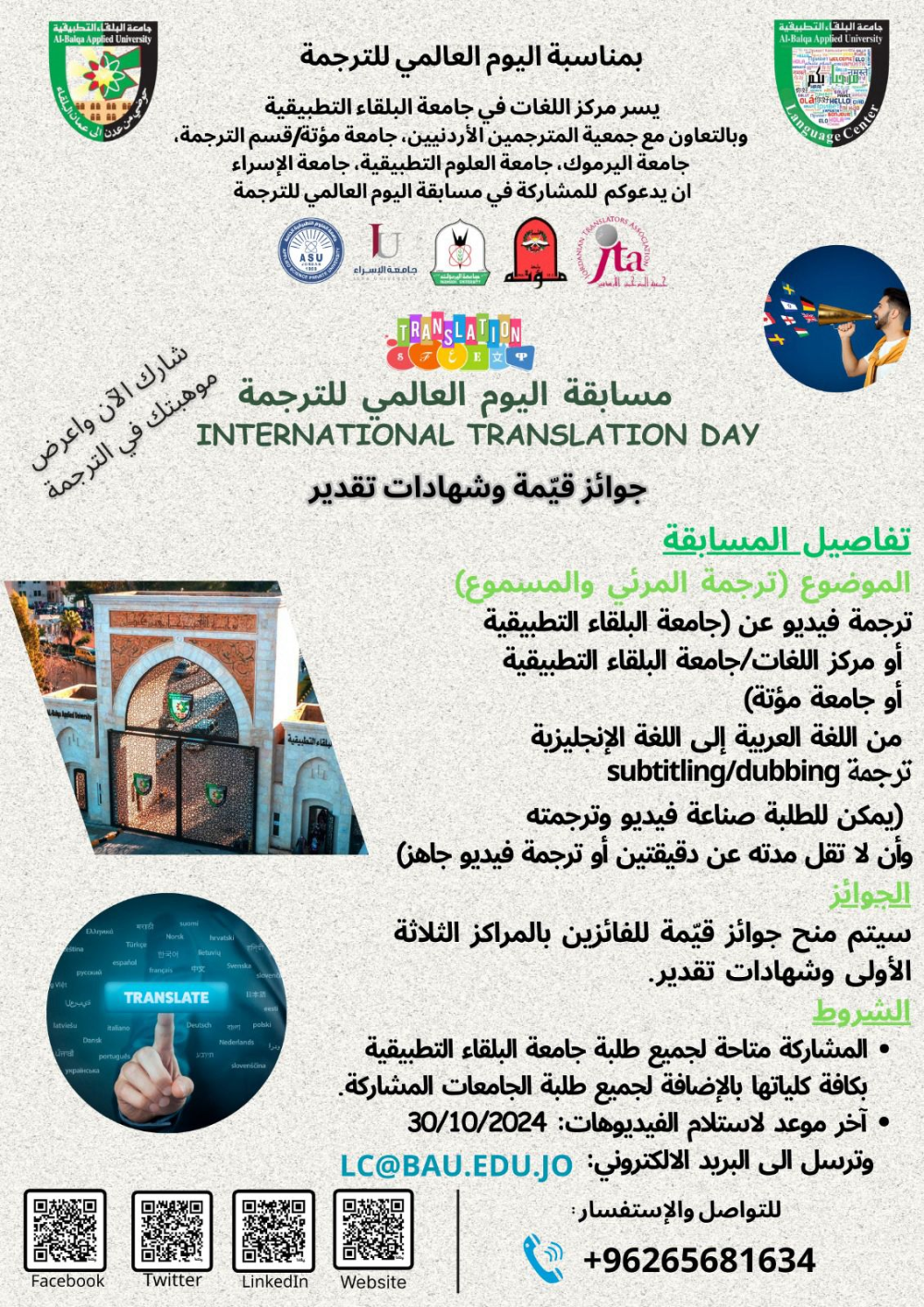 في إطار الاحتفال باليوم العالمي للترجمة بتاريخ 2024/9/30، يسر مركز اللغات في جامعة البلقاء التطبيقية، بالتعاون مع جمعية المترجمين الأردنيين، جامعة مؤتة/ قسم الترجمة، جامعة اليرموك، جامعة الإسراء، جامعة العلوم التطبيقية، دعوتكم للمشاركة في "مسابقة اليوم العالمي للترجمة".