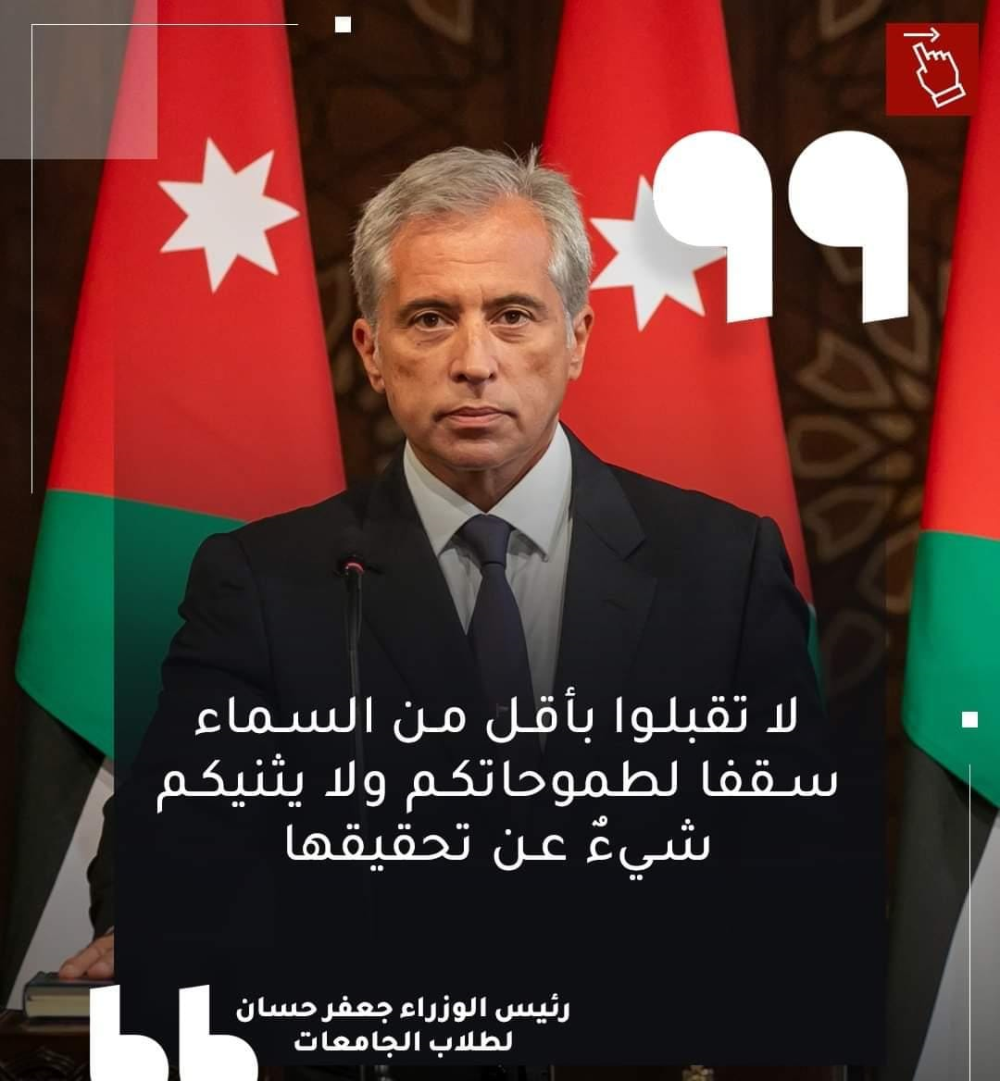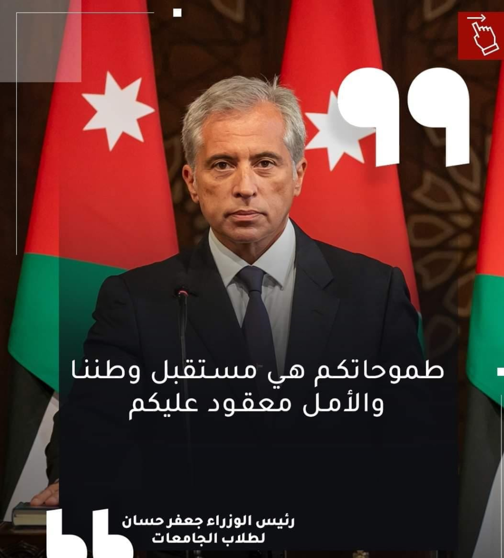 وجه رئيس الوزراء دولة الدكتور جعفر حسان رسالة إلى طلبة الجامعات الذين يبدأون الأحد 6-10-2024 يومهم الأول. وقال في تغريدة له على موقع اكس الأحد: شابات وشباب الأردن، يتوجه عدد كبير منكم إلى جامعته اليوم، ليبدأ فصلاً جديداً من حياته، ويرسم مستقبله، طموحاتكم هي مستقبل وطننا، والأمل معقود عليكم .