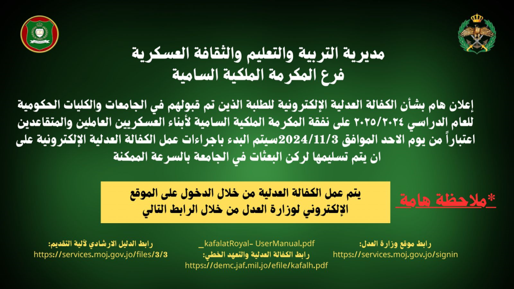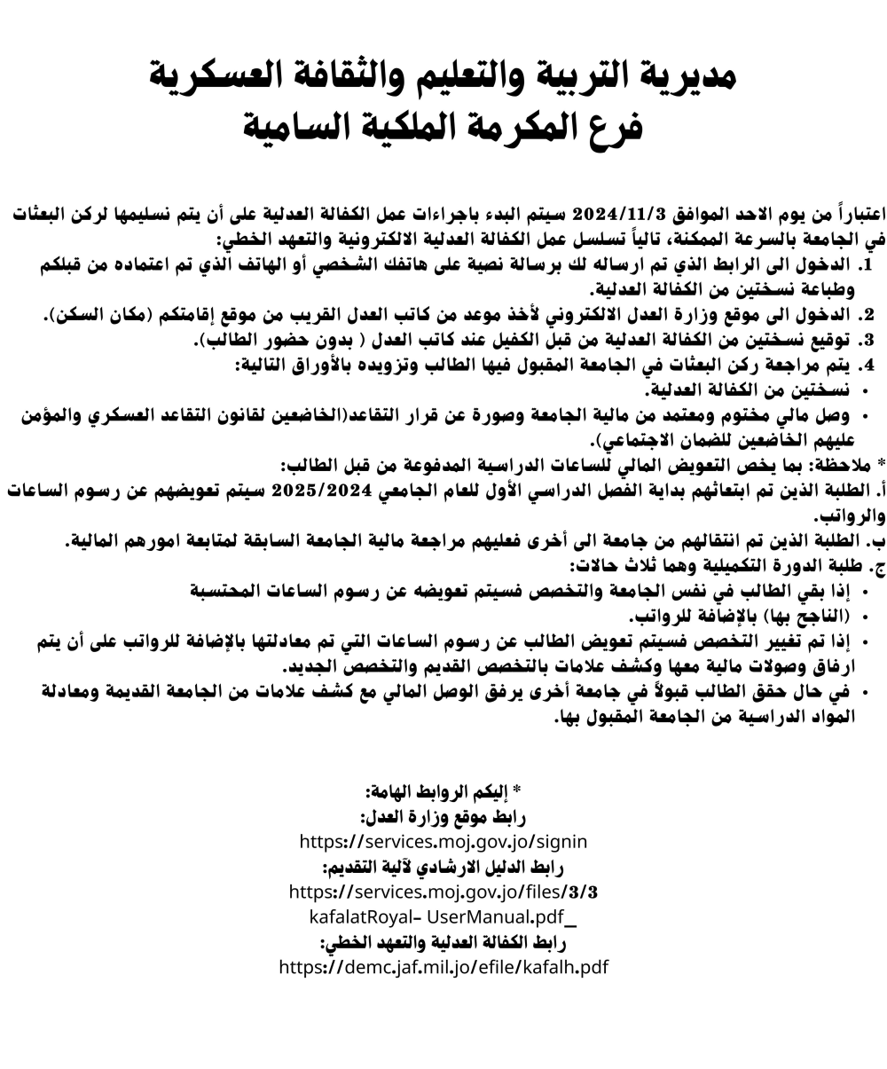 اعلان صادر من ركن البعثات العسكرية في جامعة البلقاء التطبيقية حول الكفالة العدليه واجراءاتها