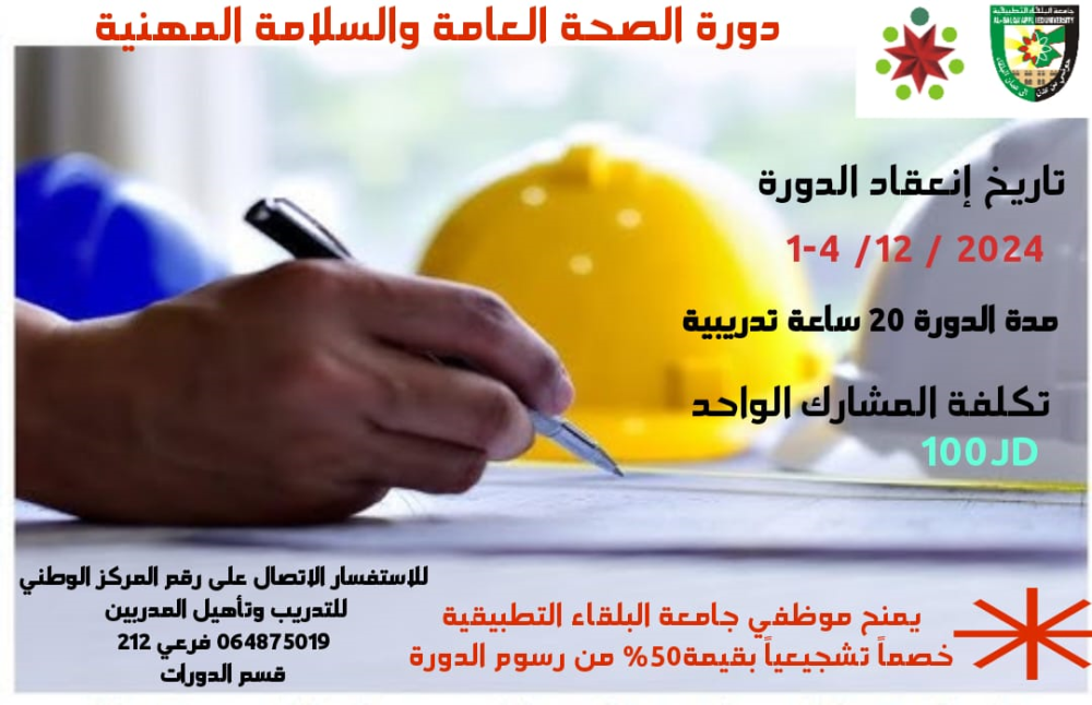 يعلن المركز الوطني للتدريب وتأهيل المدربين / جامعة البلقاء التطبيقية عن عقد دورة الصحة العامة والسلامة المهنية وذلك في الفترة 1-4 / 12 / 2024 بواقع 20 ساعة تدريبية رسوم الدورة (100) دينار للمشارك الواحد