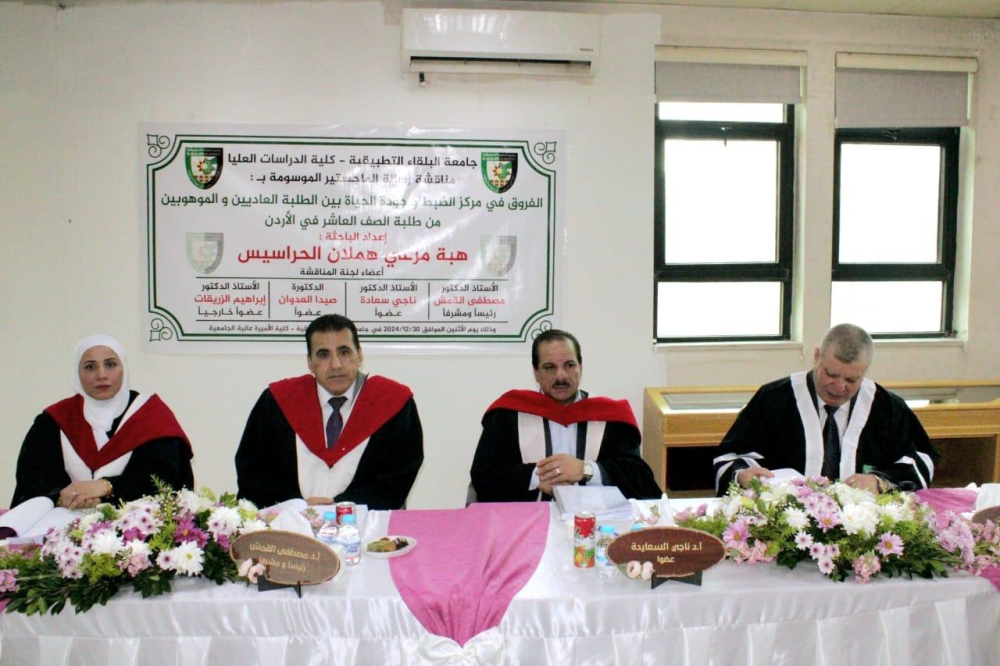 تم في كلية الأميرة عالية الجامعية في جامعة البلقاء التطبيقية مناقشة رسالة ماجستير للطالبة هبه مرعي هملان الحراسيس تخصص الموهبة والإبداع قسم علم النفس،التربية الخاصة والموسومة بـ : ( الفروق في مركز الضبط وجودة الحياة بين الطلبة العاديين والموهوبين من طلبة الصف العاشر في الاردن) )
