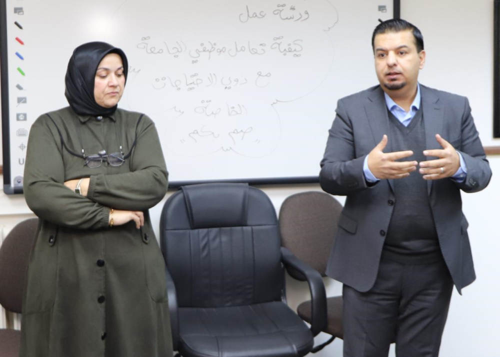 قدمت السيدة فاطمة أبورمان، رئيسة قسم دراسات السوق في المركز والمختصة بلغة الإشارة، ورشة عمل تدريبية للزملاء حول المهارات الأساسية للتواصل مع الطلاب الصم في الجامعة، بهدف تشجيعهم وتعزيز انخراطهم في البيئة الجامعية، وتسهيل الإجراءات والمعاملات عليهم فيما يتعلق بالشؤون الأكاديمية والإدارية، وخلق بيئة تحفيزية حاضنة تعزز من قدراتهم التعليمية والتفاعلية الشخصية في الجامعة، وكسر الحواجز النفسية لتمكينهم من المشاركة بفعالية أكبر.