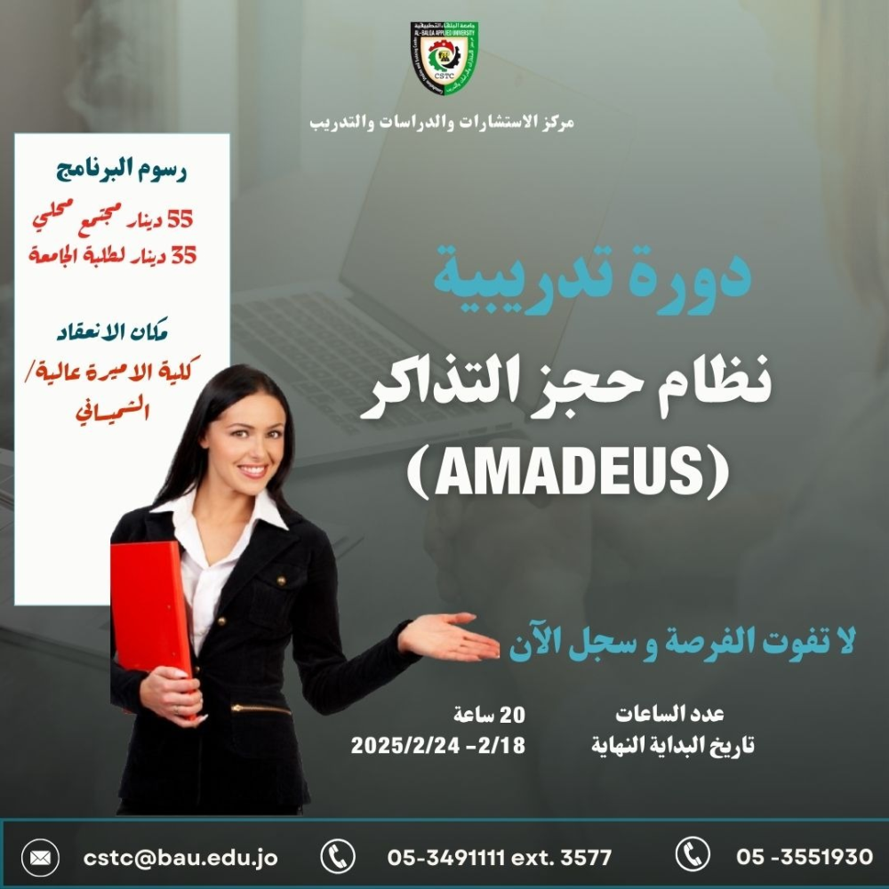 يعلن مركز الاستشارات في جامعة البلقاء التطبيقية عن عقد دورة نظام حجز التذاكرAMADEUS))