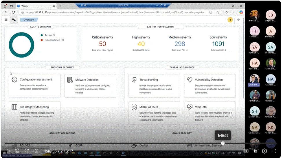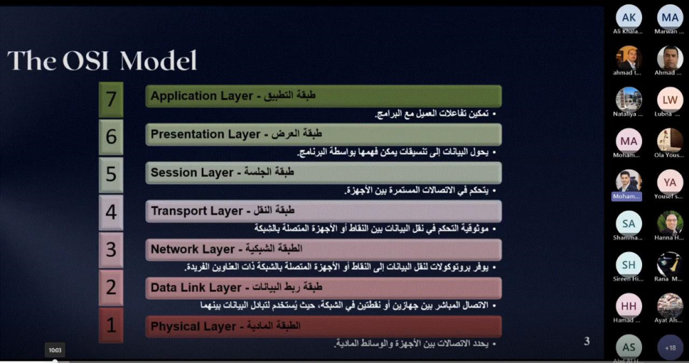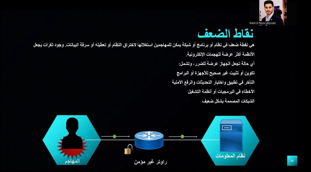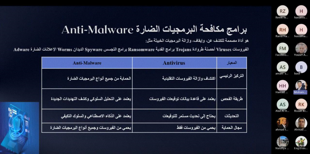 وقدّم الورشة، التي عُقدت عن بُعد، السيد محمد نور الزعبي من قسم الأمن السيبراني، حيث تناولت عدة محاور أساسية، من بينها: مفاهيم الأمن السيبراني وأهميته في حماية البيانات، ضوابط الأمن السيبراني، التهديدات السيبرانية، الحلول الأمنية مثل الجدران النارية ونظم كشف التسلل، وغيرها من المواضيع ذات الصلة، بهدف تعزيز كفاءة المشاركين في تطبيق أفضل الممارسات الأمنية.
