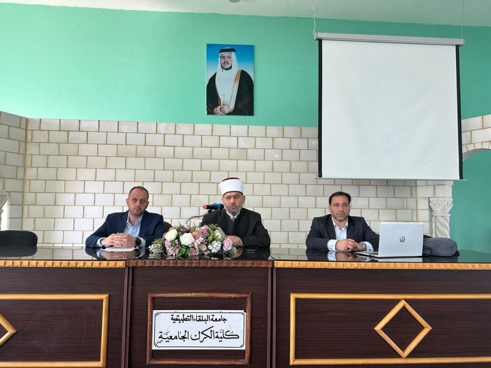 نظّمت كلية الكرك الجامعية بجامعة البلقاء التطبيقية محاضرة دينية بعنوان “نفحات إيمانية في فضائل شهر رمضان وأحكام الصيام”، ألقاها فضيلة الدكتور وليد الذنيبات، مفتي محافظة الكرك، بحضور نائب عميد الكلية الدكتور محمد الصرايرة، مندوبًا عن عميد الكلية الدكتور هارون الطراونة، إضافة إلى أعضاء الهيئتين التدريسية والإدارية وطلبة الكلية.