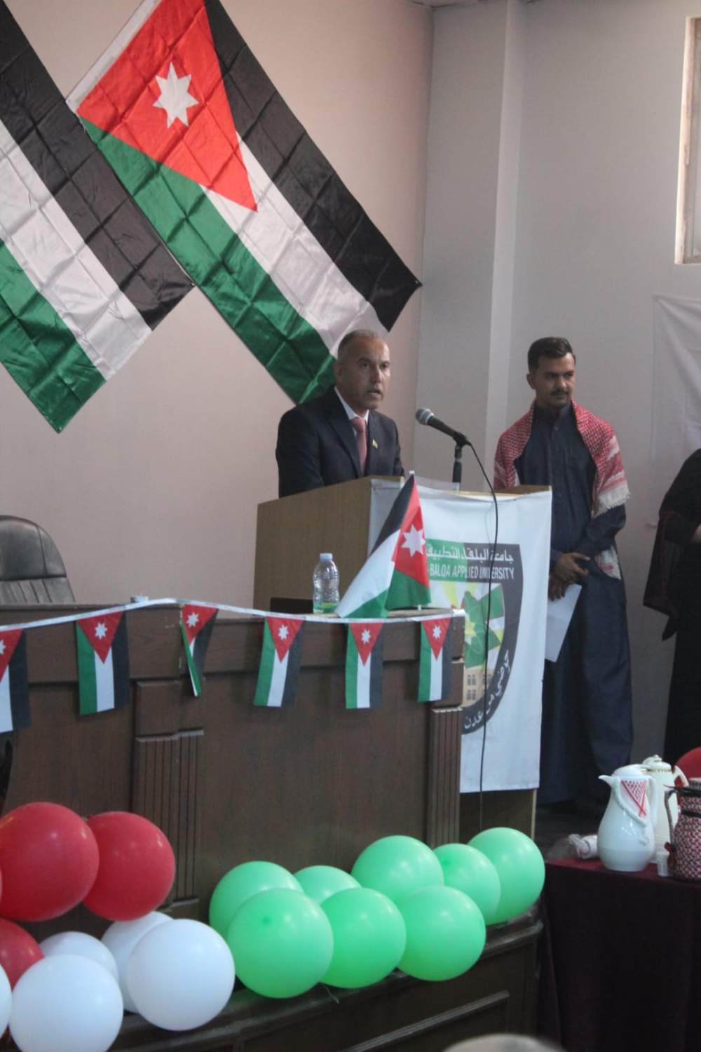 كما ألقى عميد الكلية كلمة بهذه المناسبة، عبّر فيها عن اعتزازه واعتزاز أسرة الكلية بهذه المناسبة الوطنية العزيزة، مشيرًا إلى أن "علمنا الأردني ليس مجرد راية ترفرف، بل هو رمز للهوية والعزة والكرامة، ويمثل تاريخنا المجيد وحاضرنا المزدهر ومستقبلنا الواعد تحت ظل القيادة الهاشمية الحكيمة." وأضاف أن الاحتفال بيوم العلم هو تجديد للعهد والولاء للوطن وقيادته، مؤكّدًا أهمية ترسيخ القيم الوطنية في نفوس الطلبة وتعزيز شعورهم بالمسؤولية تجاه وطنهم.