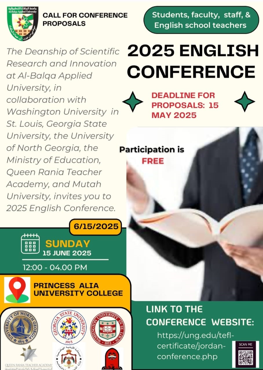 يسر عمادة البحث العلمي والابتكار في جامعة البلقاء التطبيقية، بالتعاون مع جامعة واشنطن في سانت لويس، وجامعة ولاية جورجيا، وجامعة شمال جورجيا، في الولايات المتحدة الأمريكية، ووزارة التربية والتعليم، وأكاديمية الملكة رانيا لتدريب المعلمين، وجامعة مؤتة، أن تدعوكم للمشاركة في: