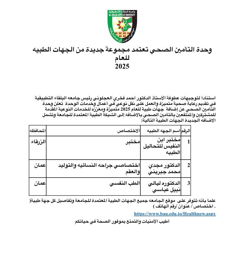 وحدة التأمين الصحي في جامعة البلقاء التطبيقية تعتمد مجموعة جديدة من الجهات الطبية للعام 2025