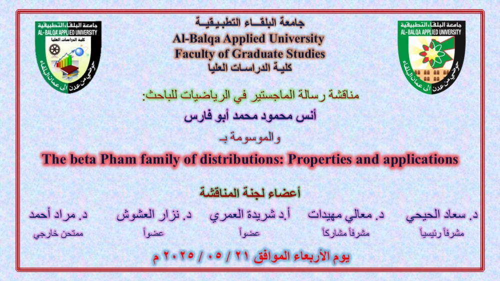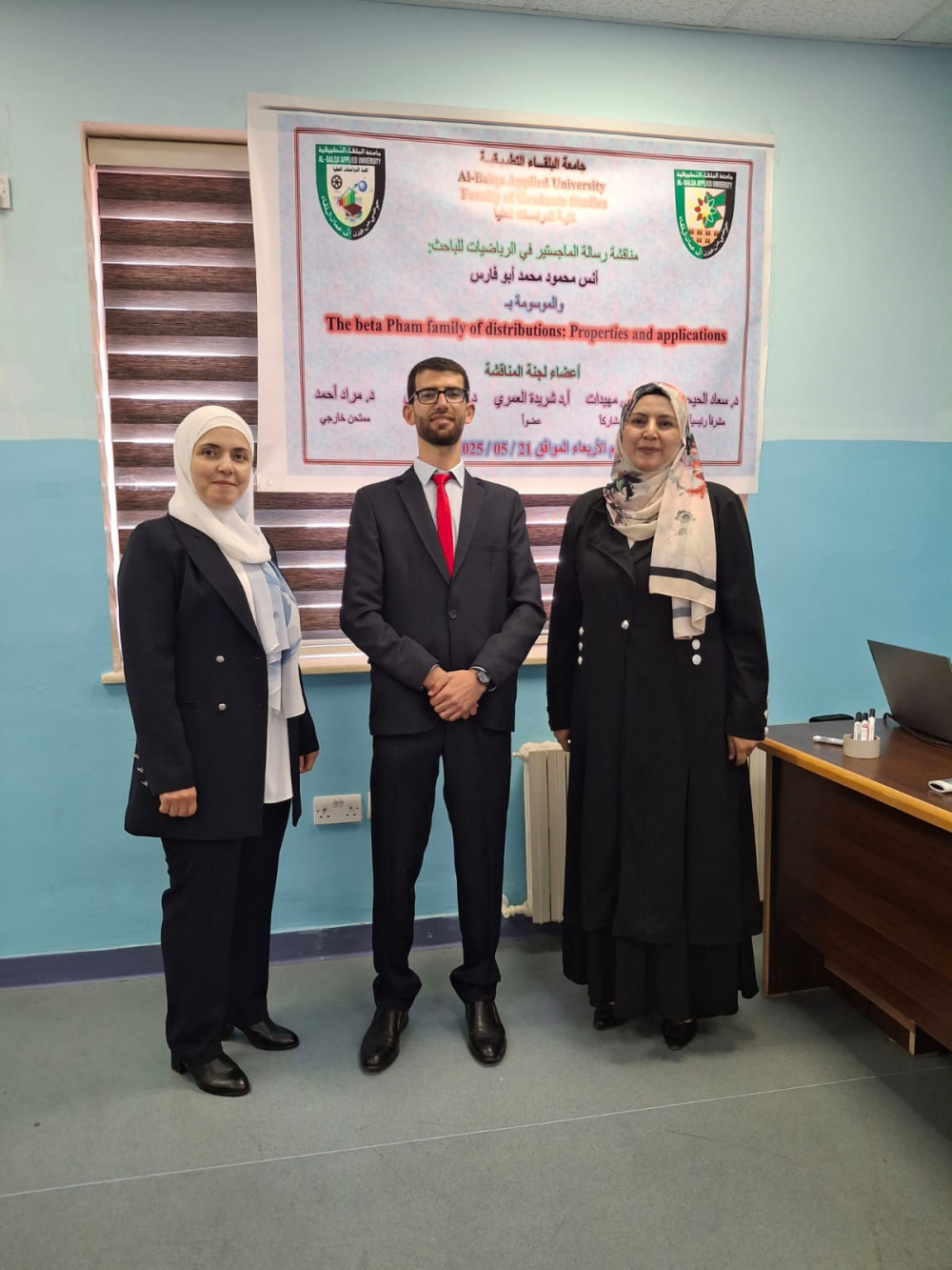 مناقشة رسالة ماجستير بقسم الرياضيات في كلية العلوم في جامعة البلقاء التطبيقية / السلط لطالب أنس محمود محمد أبو فارس
