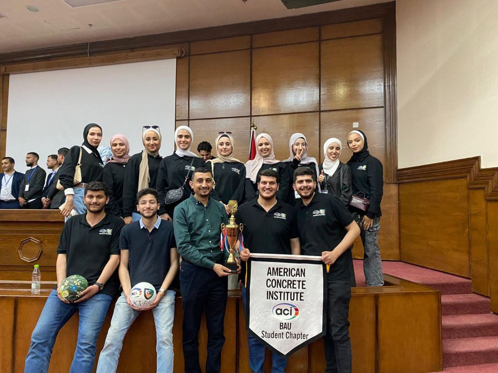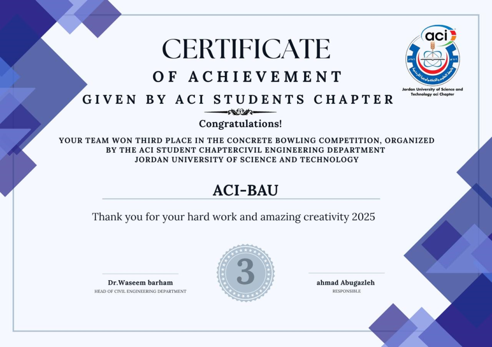 فاز فريق الفرع الطلابي لمعهد الخرسانة الأمريكية (ACI-BAU) – قسم الهندسة المدنية في كلية الهندسة – المركز، جامعة البلقاء التطبيقية، بالمركز الثالث في تصميم كرات خرسانية ذات مواصفات فنية خاصة، ضمن مسابقة Concrete Bowling Competition، التي نظمها فريق الفرع الطلابي لمعهد الخرسانة الأمريكية في جامعة العلوم والتكنولوجيا الأردنية.