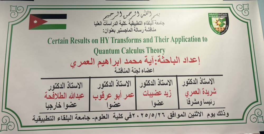 تم في ظهر يوم الإثنين الموافق 26/5/2025 مناقشة رسالة ماجستير للطالبة آية محمد إبراهيم العمري بقسم الرياضيات في كلية العلوم في جامعة البلقاء التطبيقية/ السلط و بعنوان :