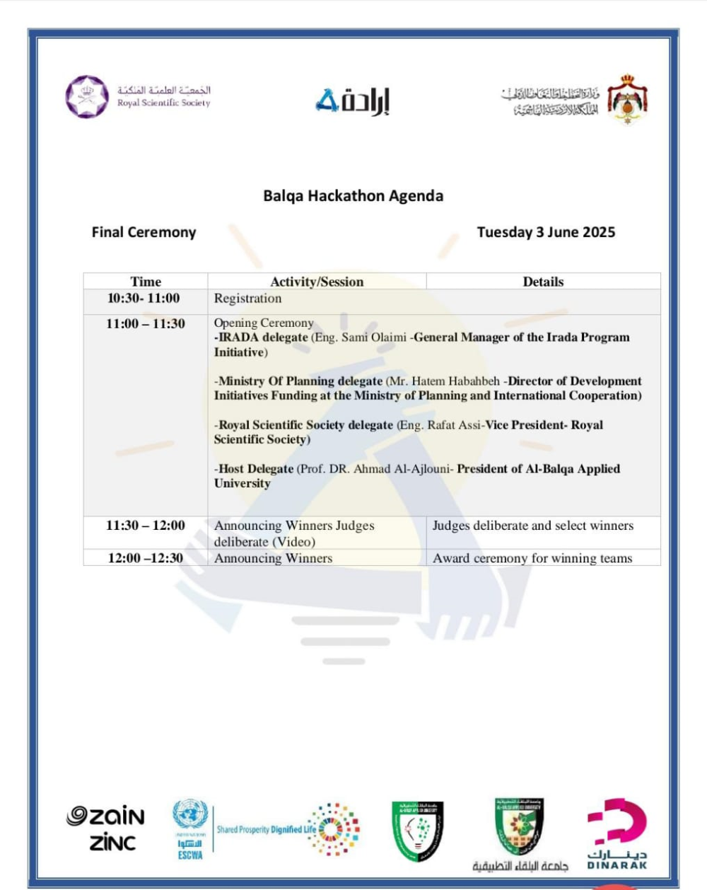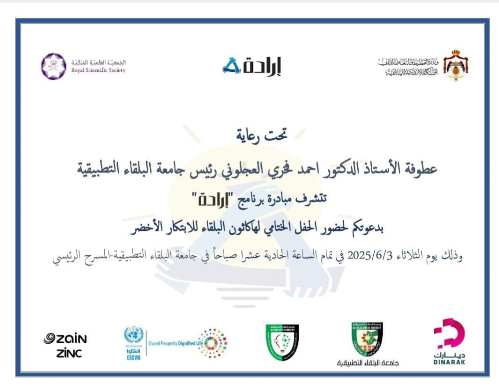 مركز الإبتكار والإبداع وريادة الأعمال يدعوكم لحضور الحفل الختامي لهاكاثون البلقاء للإبتكار الأخضر