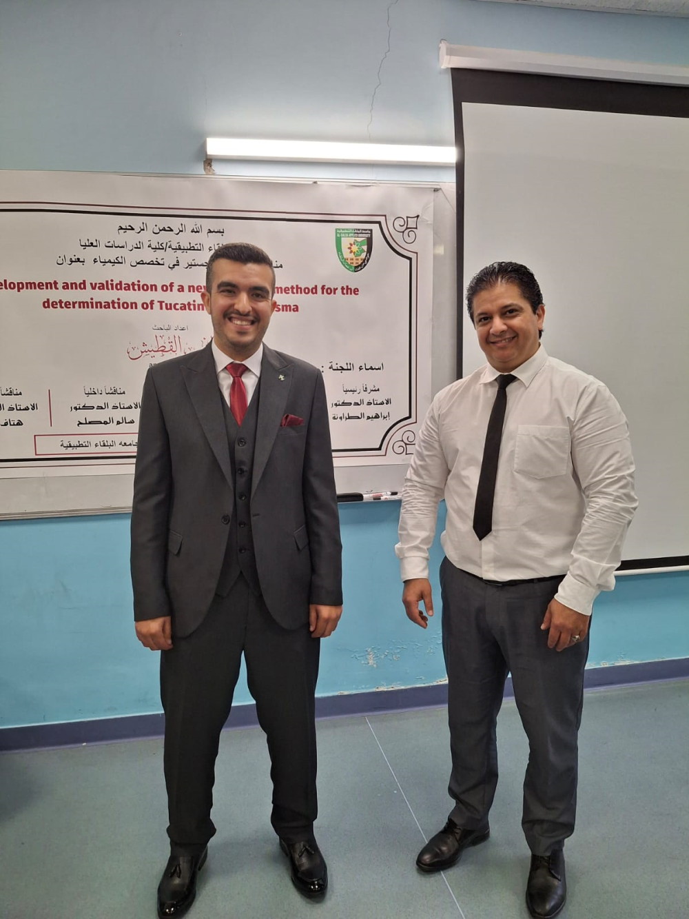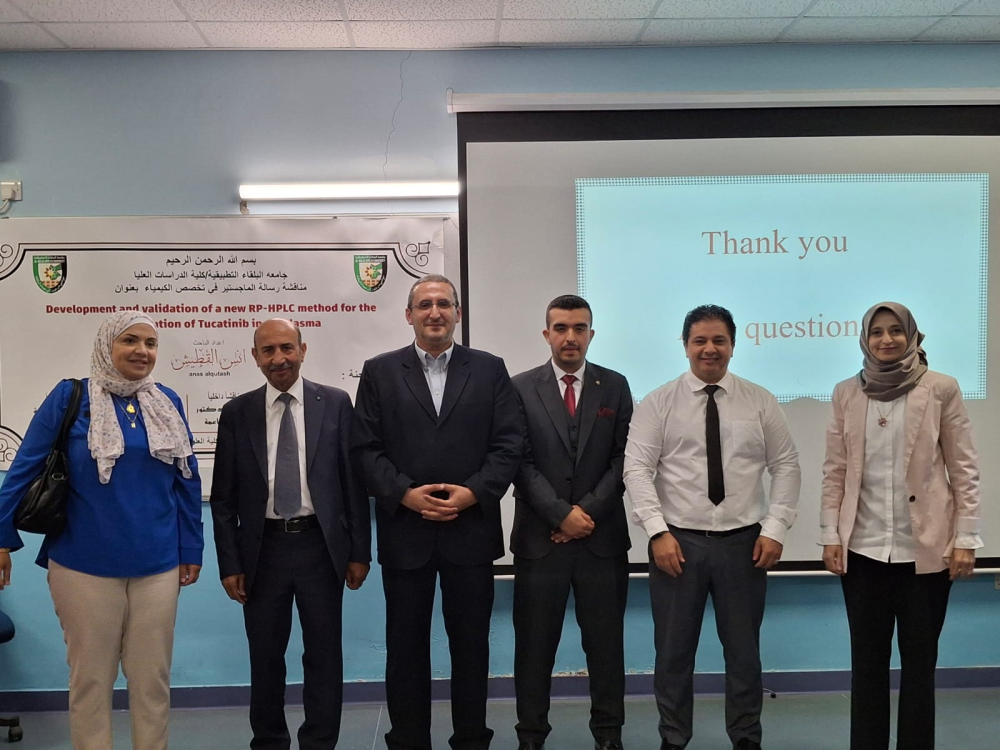 تم في جامعة البلقاء التطبيقية- كلية العلوم - قسم الكيمياء، مناقشة رسالة الماجستير المقدمة من الطالب أنس القطيش، حيث قام بتطوير طريقة جديدة باستخدام كروماتوغرافيا السوائل عالية الأداء لدراسة عقار توكاتينيب المستخدم لعلاج سرطان الثدي وسرطان القولون والمستقيم، تحت عنوان: