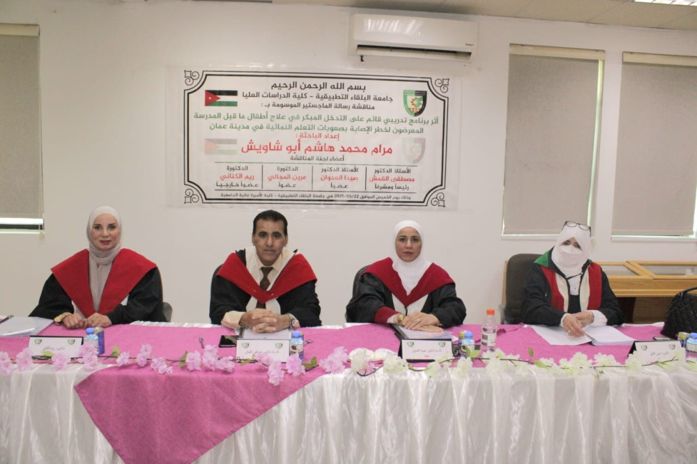 تم في مساء يوم الخميس الموافق 22/5/2025 ، مناقشة رسالة ماجستير للطالبة مرام محمد هاشم أبو شاويش تخصص تربية خاصة/ صعوبات التعلم قسم علم النفس، التربية الخاصة والموسومة بـ:(أثر برنامج تدريبي قائم على التدخل المبكر في علاج أطفال ما قبل المدرسة المعرضون لخطر الإصابة بصعوبات التعلم النمائية في مدينة عمان )