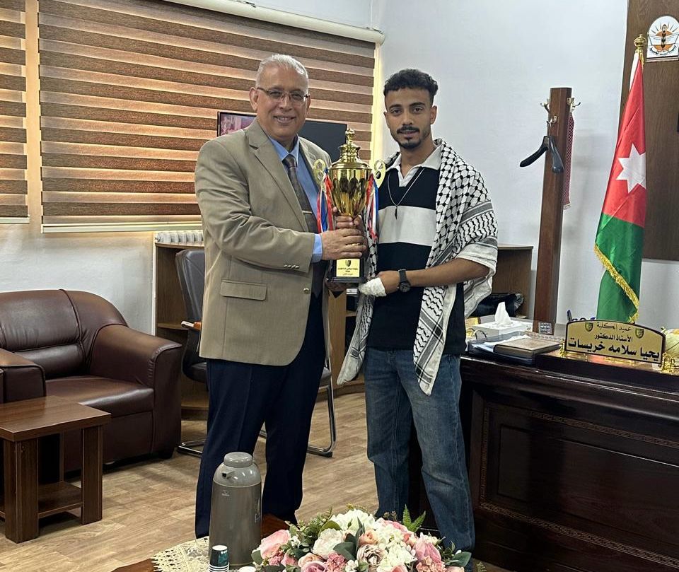 وسلّم لاعبو الفريق كأس المركز الثاني لعميد الكلية الأستاذ الدكتور يحيا سلامة خريسات، بحضور رئيس قسم النشاطات الدكتور مراد ذيابات ، تقديرًا لدعم إدارة الكلية المتواصل للحركة الرياضية.
