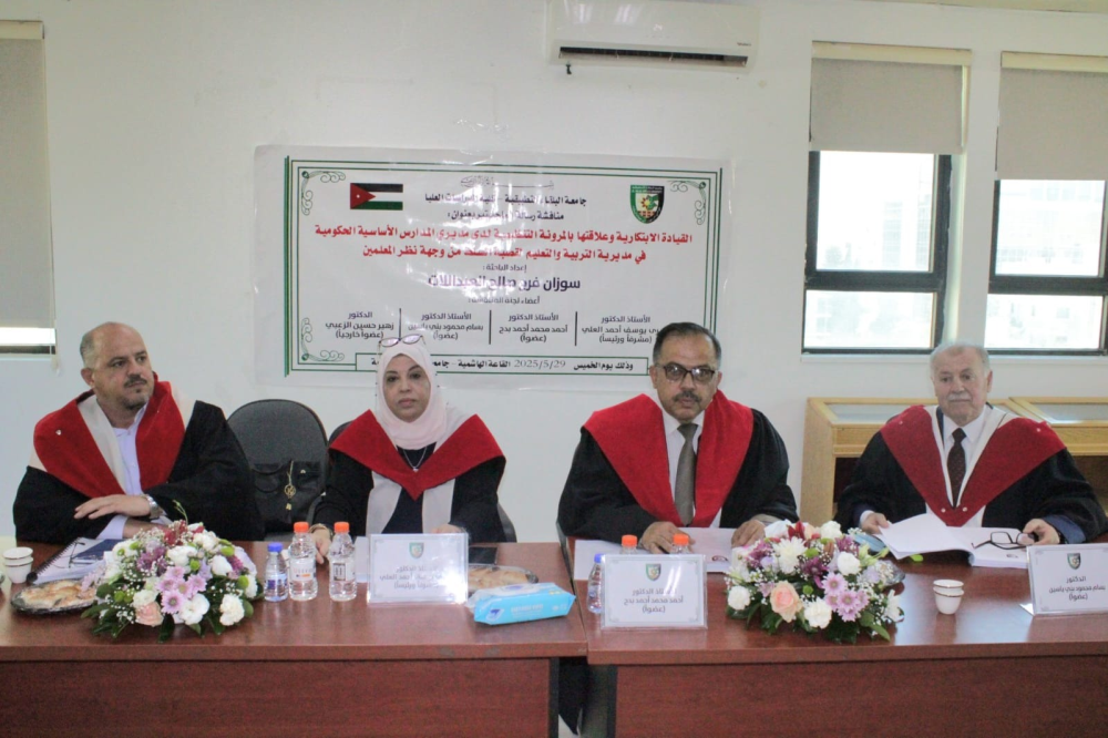 تم في صباح يوم الخميس الموافق 29/5/2025 مناقشة رسالة ماجستير للطالبة سوزان فرج صالح العبدالات تخصص الإدارة التربوية، قسم العلوم التربوية بعنوان ( القيادة الابتكارية وعلاقتها بالمرونة التنظيمية لدى مديري المدارس الأساسية الحكومية في مديرية التربية والتعليم لقصبة السلط من وجهة نظر المعلمين )