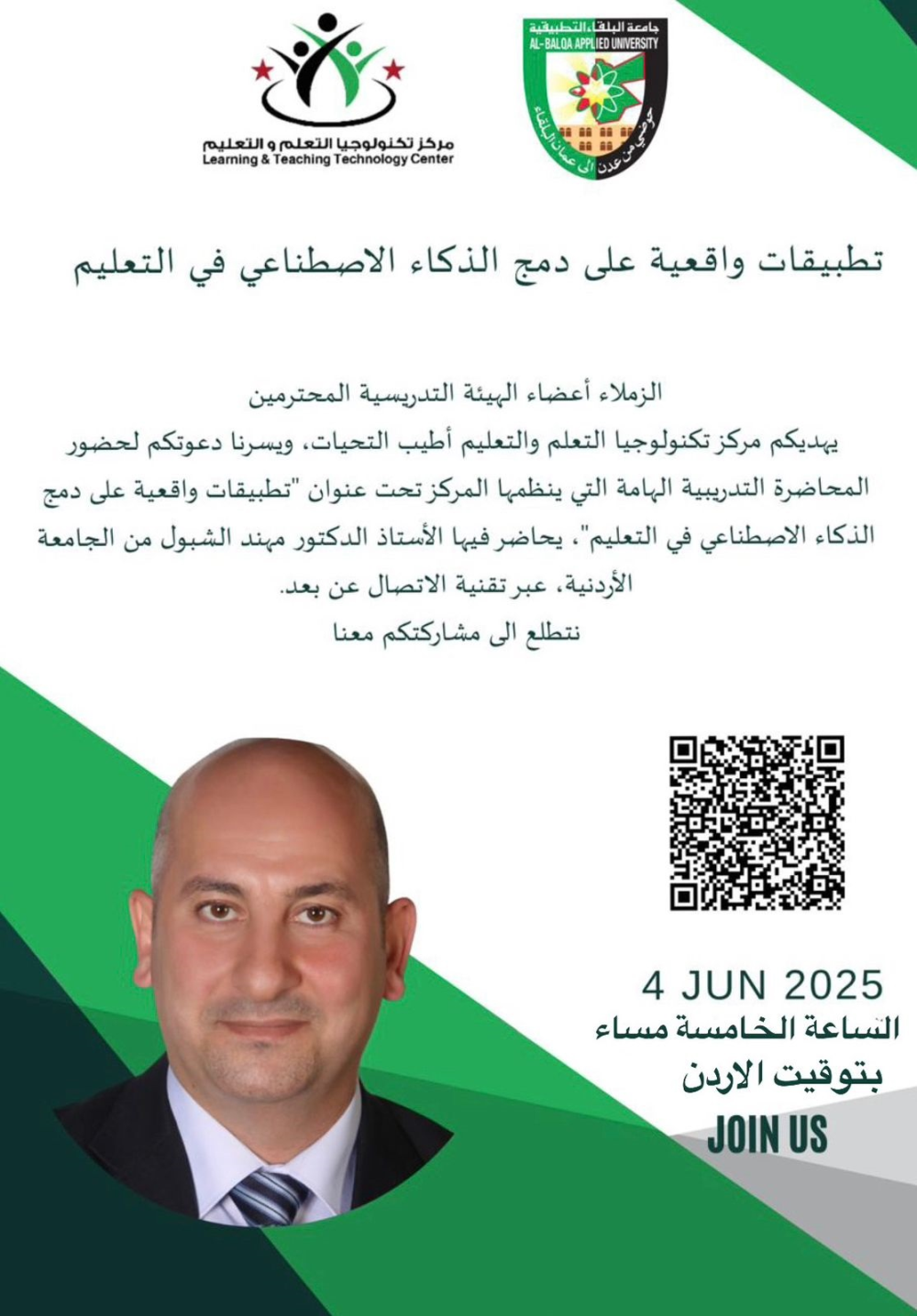 يهديكم مركز تكنولوجيا التعلم والتعليم أطيب التحيات، ويسرنا دعوتكم لحضور المحاضرة التدريبية الهامة التي ينظمها المركز تحت عنوان "تطبيقات واقعية على دمج الذكاء الاصطناعي في التعليم"، يحاضر فيها الأستاذ الدكتور مهند الشبول من الجامعة الأردنية، يوم الاربعاء الموافق 4/06/2025، الساعة الخامسة مساء، عبر تقنية الاتصال عن بعد.