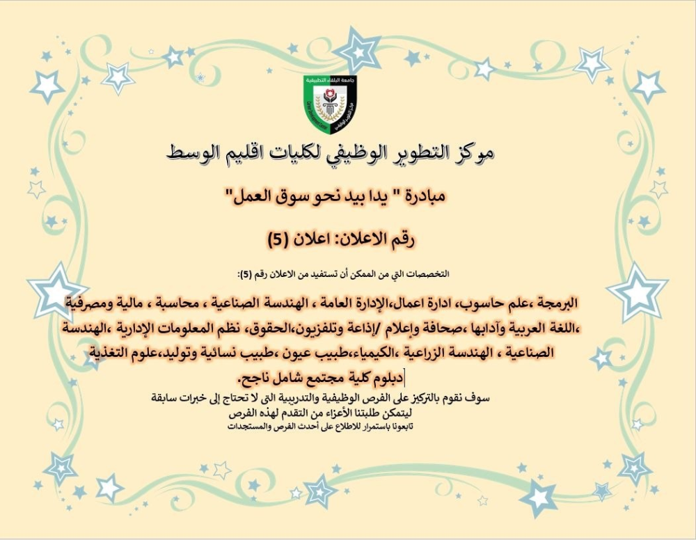 استمرارًا لجهود مركز التطوير الوظيفي لكليات إقليم الوسط في جامعة البلقاء التطبيقية ضمن مبادرة "يدا بيد نحو سوق العمل"، نواصل تقديم الدعم لطلبتنا وخريجينا عبر توفير فرص توظيف وتدريب متميزة ومتنوعة، تشمل مختلف التخصصات الأكاديمية والمهنية، وتركز على الفرص التي لا تشترط وجود خبرات سابقة.
