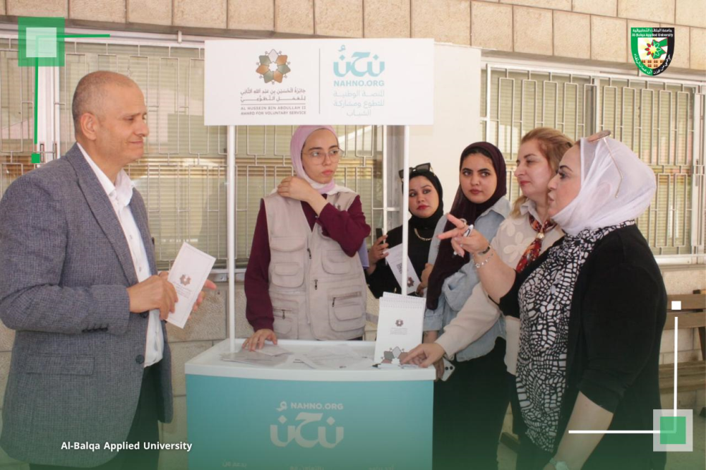 ضمن أًطر التزام جامعة البلقاء التطبيقية والكليات التابعة لها بتحقيق الهدف الرابع من أهداف التنمية المستدامة (SDG 4 – Quality Education)، والذي يُعنى بضمان التعليم الجيد المنصف والشامل للجميع وتعزيز فرص التعلم، وتجسيدًا لتوجيهات رئيس جامعة البلقاء التطبيقية الأستاذ الدكتور أحمد فخري العجلوني الرامية إلى تعزيز الشراكة بين الجامعة ومختلف القطاعات الحكومية والخاصة رعى الأستاذ الدكتور طارق أبو هزيم /قائم بأعمال عميد كلية الأميرة عالية الجامعية وبالتنسيق مع مساعد العميد للشؤون الطلابية الدكتورة مي الرقاد المشاركة في الدورة الثالثة من جائزة الحسين بن عبدالله الثاني للعمل التطوعي بالتعاون مع مؤسسة ولي العهد /منصة (نحن) تخصيص بوثات ترويجية داخل حرم الكلية لعرض معلومات الجائزة من خلال سفراء ومتطوعين منصة (نحن).
