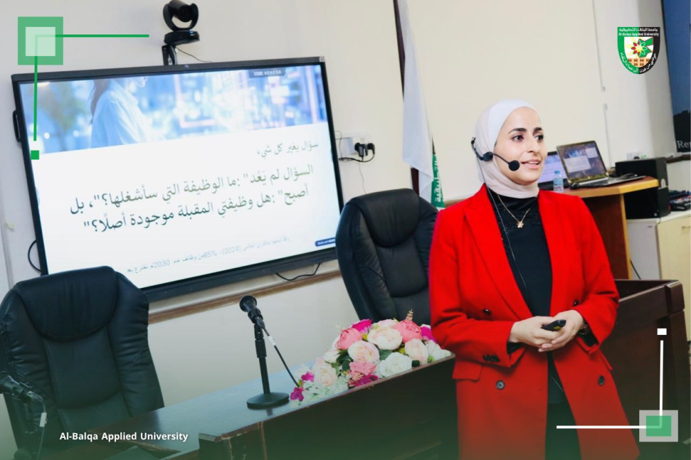 عُقد في المركز الأردني الكوري للمعلومات وتكنولوجيا الاتصالات، بالتعاون مع مؤسسة ولي العهد – مكتب البلقاء، محاضرة بعنوان:“المهن الجديدة في العالم الرقمي”، على مسرح المركز في جامعة البلقاء التطبيقية – السلط.