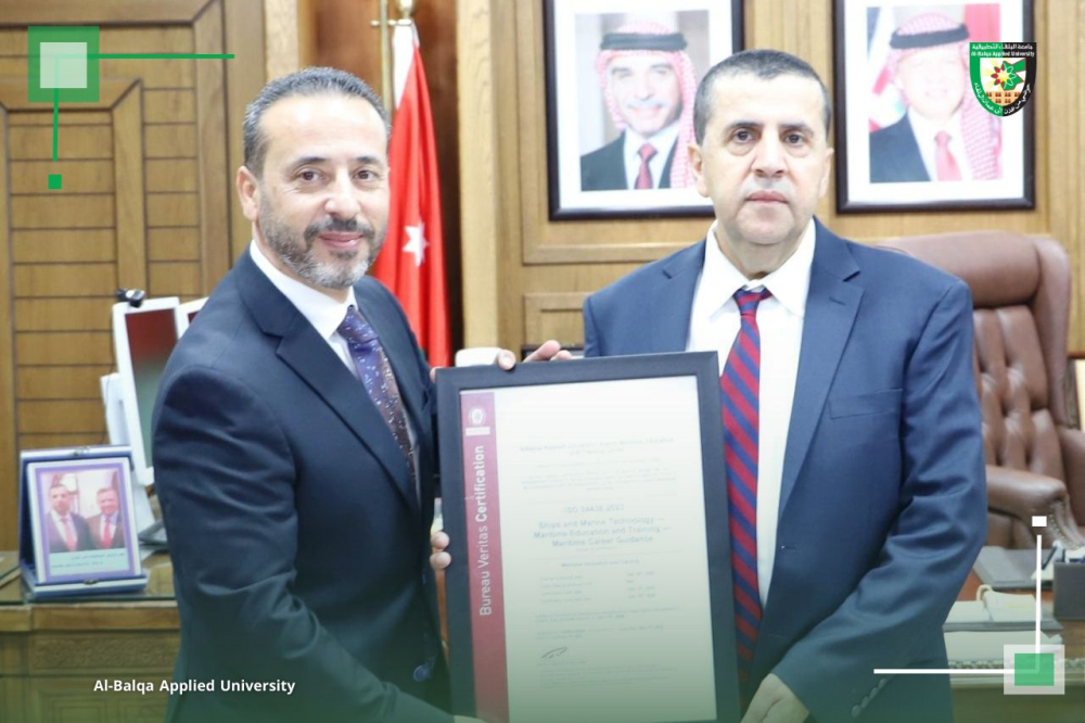 في إنجاز نوعي يعزز مكانتها الأكاديمية والمهنية، تسلّمت جامعة البلقاء التطبيقية ثلاث شهادات جودة دولية مرموقة لمركز العقبة للتعليم والتدريب البحري، من هيئة التصنيف العالمية الفرنسية Bureau Veritas (BV)، وذلك تقديراً لالتزام المركز بتطبيق أعلى المعايير العالمية في برامجه التدريبية والأكاديمية.