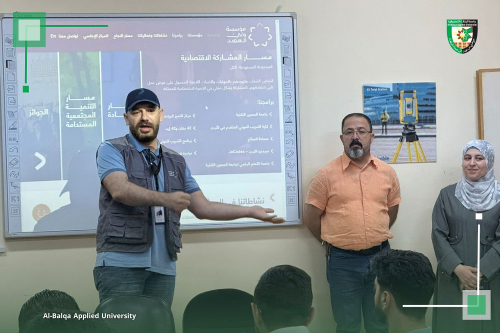 استضافت كلية معان الجامعية جلسة تعريفية قدمها الأستاذ مهند أبو هلالة من مؤسسة ولي العهد، للتعريف ببرامج المؤسسة الهادفة إلى تمكين الشباب الأردني وإعدادهم ليكونوا قادة فاعلين في مجتمعاتهم.