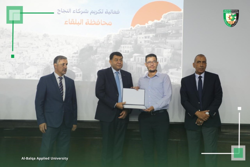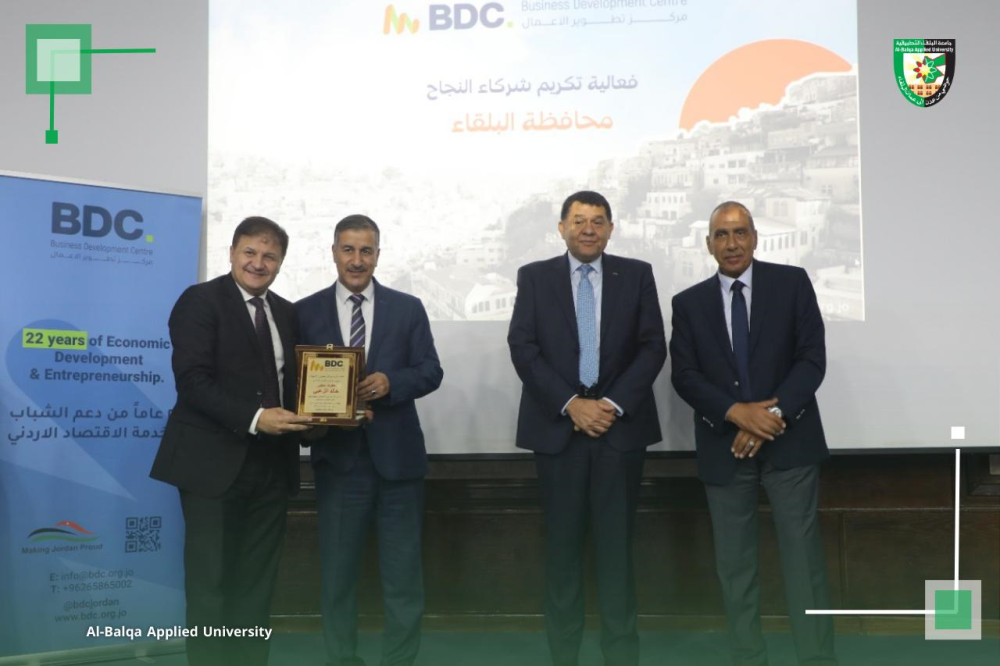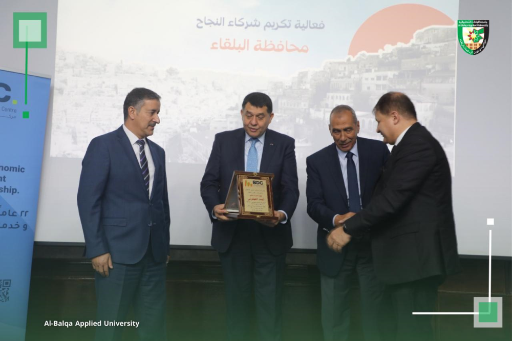 شاركت جامعة البلقاء التطبيقية في حفل تكريم الشركاء الذي نظّمه مركز تطوير الأعمال برعاية عطوفة محافظ البلقاء الدكتور فيصل المساعيد، ومعالي نايف استيتية مؤسس المركز، تقديراً للجهود والإنجازات التي حققتها الجامعة من خلال تعاونها المثمر مع المركز في تنفيذ برامج ومبادرات نوعية تستهدف الطلبة والمجتمع المحلي.