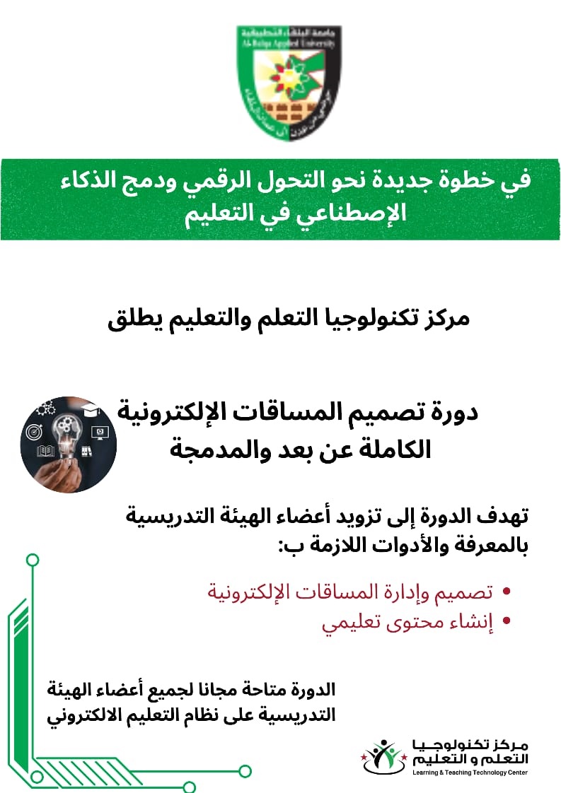 في خطوة ريادية نحو تطوير قدرات أعضاء هيئة التدريس في مجال تصميم الدورات القصيرة المنتهية بشهادة ، يُطلق مركز تكنولوجيا التعلم والتعليم دورة تدريبية متخصصة بعنوان: "تصميم المساقات الإلكترونية الكاملة – عن بُعد والمدمجة"، حيث دمجت تقنيات الذكاء الاصطناعي في التعلم؛ للمساعدة على تصميم مساقات إلكترونية تفاعلية عالية الجودة.