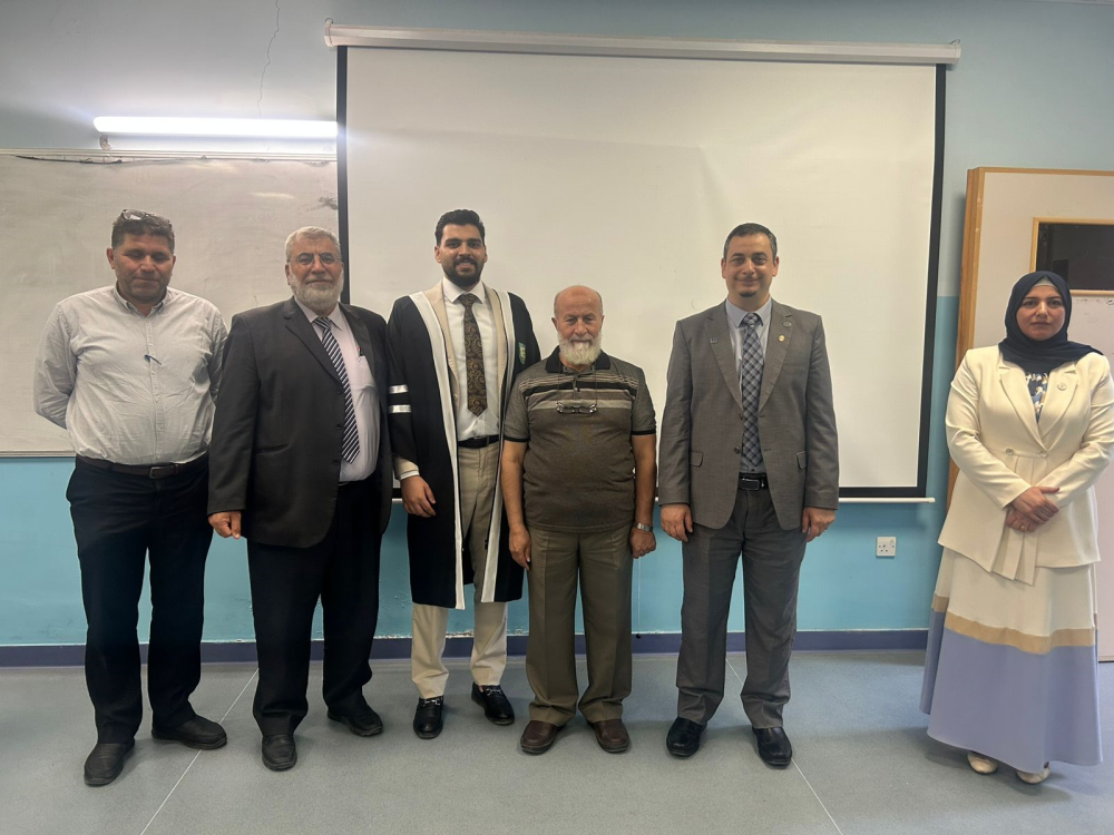 و ترأس لجنة المناقشة الدكتورة آلاء علي طوالبه والدكتور بلال عمرو ( رئيسا مشاركا ) ، و ضمت اللجنة في عضويتها كلا من : الأستاذ الدكتور عمر عبد العزيز لافي ( عميد كلية العلوم في الجامعة ) والدكتور محمود أبو خرمة ( جامعة البلقاء التطبيقية ) والممتحن الخارجي الدكتور رياض عبابنة ( جامعة اليرموك ) .