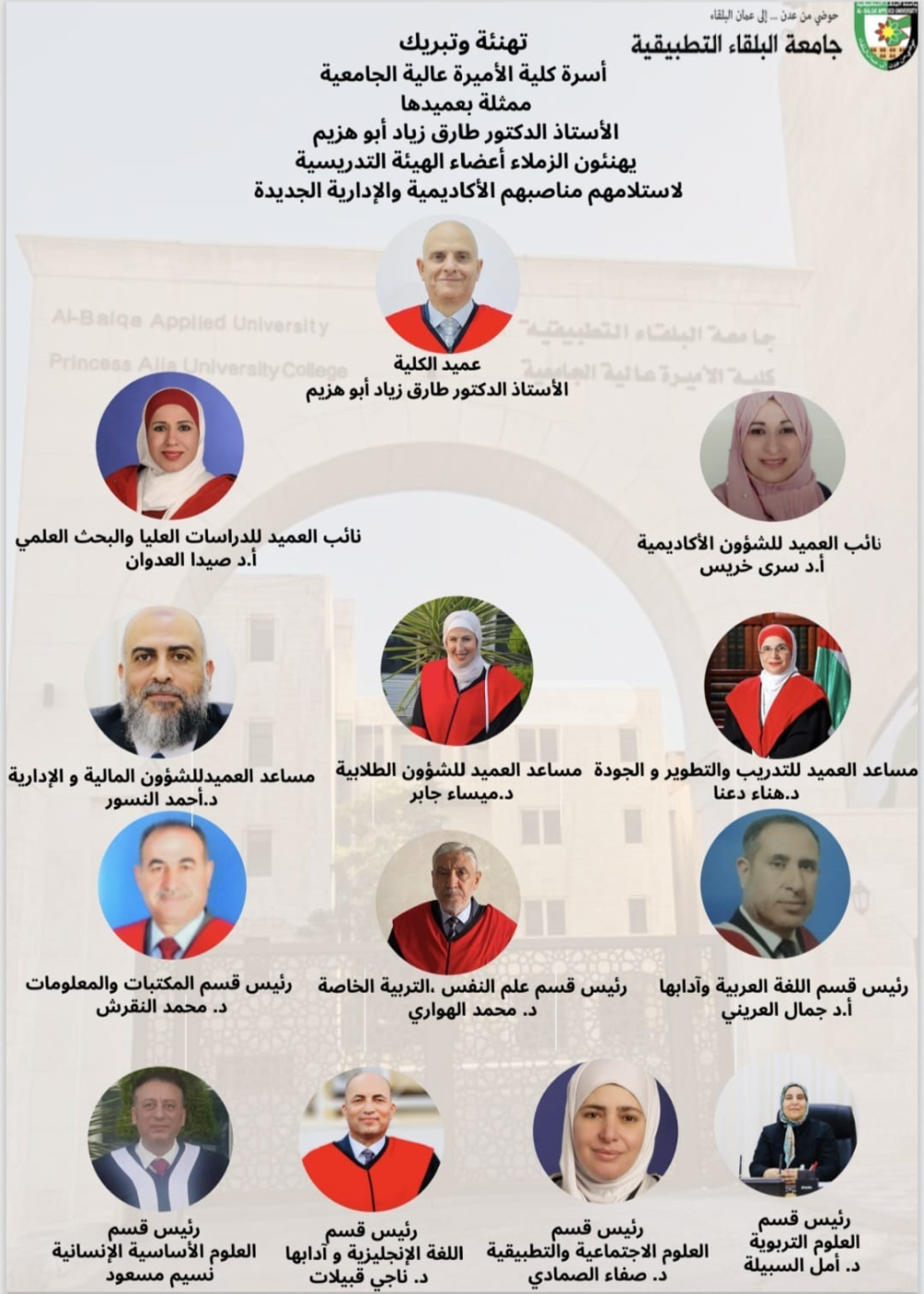 أسرة كلية الأميرة عالية الجامعية يهنئون الزملاء أعضاء الهيئة التدريسية لإستلامهم مناصبهم الأكاديمية والإدارية