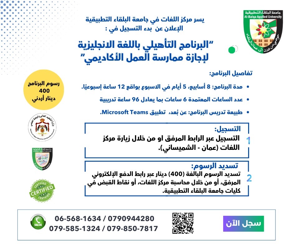 يُعلن مركز اللغات – جامعة البلقاء التطبيقية عن فتح باب التسجيل في: