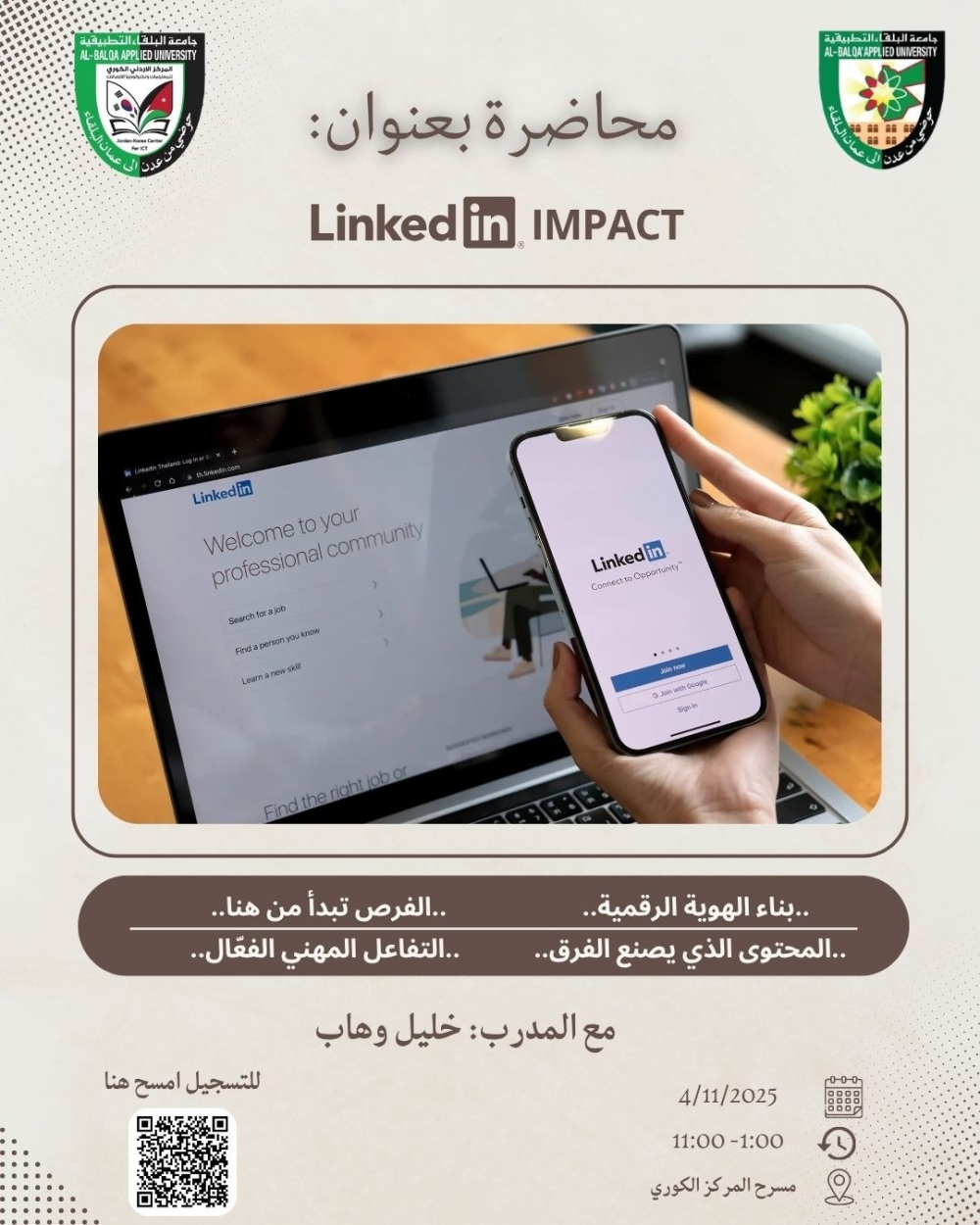 اعلان عن محاضرة بعنوان (أثرك على LinkedIn ) لطلبة الجامعة والتي سيتم عقدها بالمركز الاردني الكوري يوم الثلاثاء بتاريخ 2025/11/4