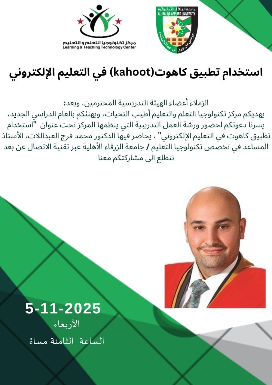 يسر مركز تكنولوجيا التعلم والتعليم دعوتكم لحضور المحاضرة التدريبية التي ينظمها المركز تحت عنوان  "استخدام تطبيق كاهوت (Kahoot) في التعليم الإلكتروني" يوم الأربعاء الموافق 5/11/2025، الساعة الثامنة مساء، يحاضر فيها الدكتور محمد فرج العبداللات، الأستاذ المساعد في تخصص تكنولوجيا التعليم / جامعة الزرقاء الأهلية عبر تقنية الاتصال عن بعد.