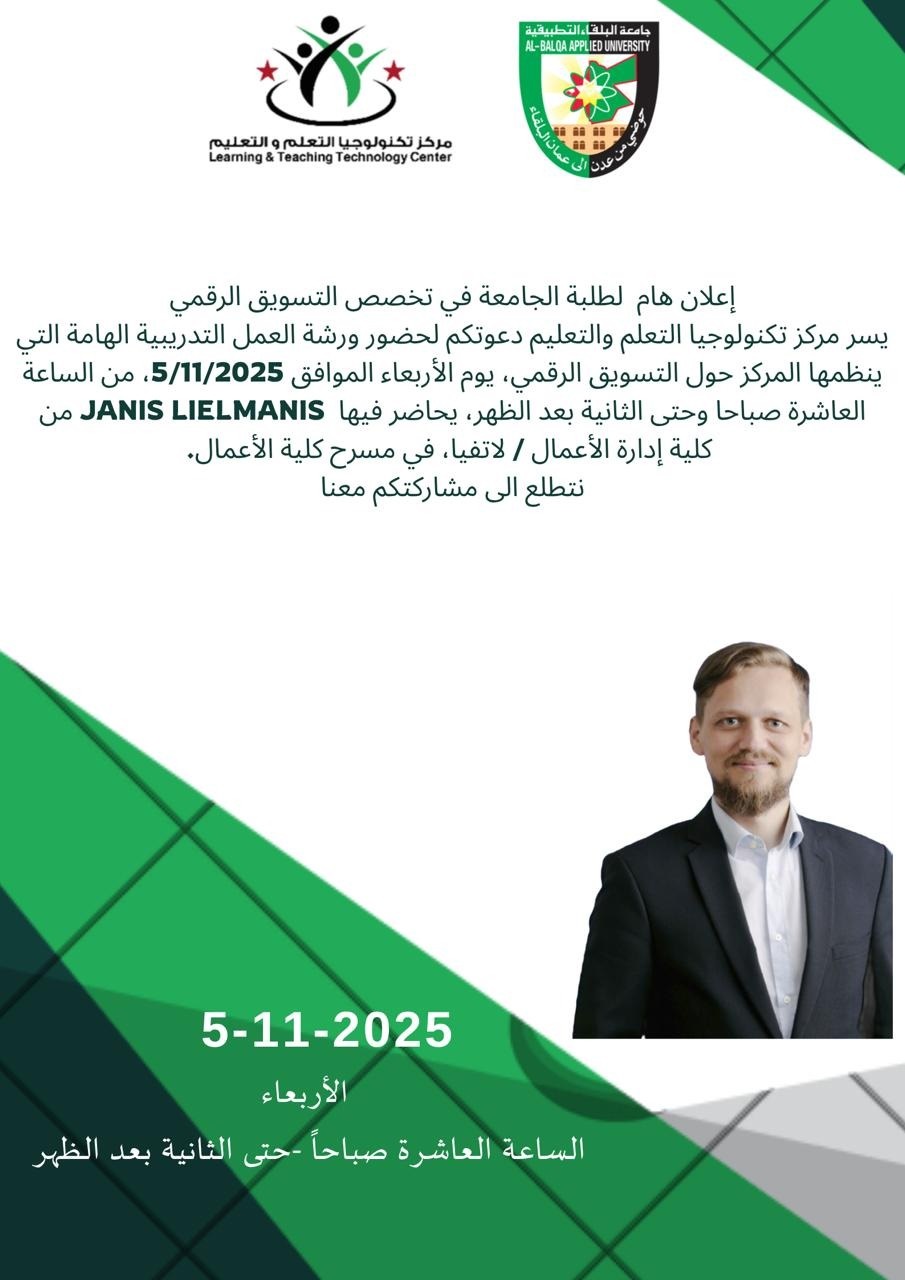 يسر مركز تكنولوجيا التعلم والتعليم بالتعاون مع كلية الأعمال دعوتكم لحضور ورشة العمل التدريبية الهامة التي ينظمها المركز حول التسويق الرقمي، يوم الأربعاء الموافق 5/11/2025، من الساعة العاشرة صباحا وحتى الثانية بعد الظهر، يحاضر فيها  Janis Lielmanis من كلية إدارة الأعمال / لاتفيا، في مسرح كلية الأعمال.