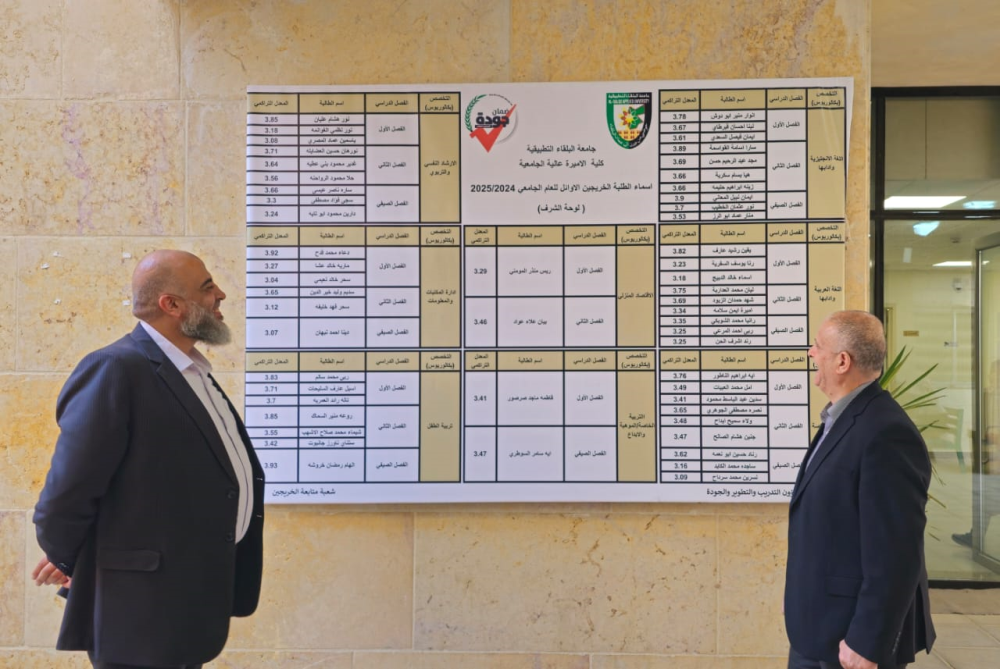 تثبيت لوحة الشرف للطلبة الأوائل في كلية الأميرة عالية الجامعية بجامعة البلقاء التطبيقية للعام الجامعي 2024/2025