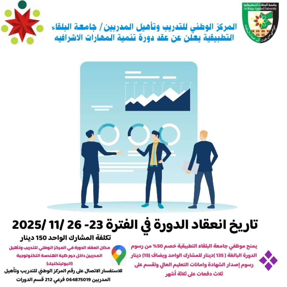 يعلن المركز الوطني للتدريب وتأهيل المدربين / جامعة البلقاء التطبيقية عن عقد دورة تنمية المهارات الاشرافية وذلك في الفترة من 23 – 26 / 11 / 2025