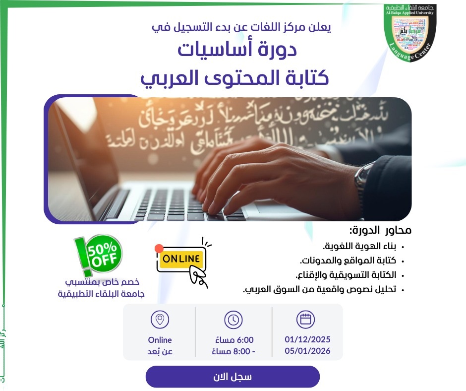 يعلن مركز اللغات – جامعة البلقاء التطبيقية عن فتح باب التسجيل في دورة أساسيات كتابة المحتوى العربي، المصمّمة لتزويدك بمهارات الكتابة التسويقية وصياغة المحتوى للمواقع والمدونات وبناء هوية لغوية قوية، مع تدريبات عملية مستندة إلى نصوص من السوق العربي.