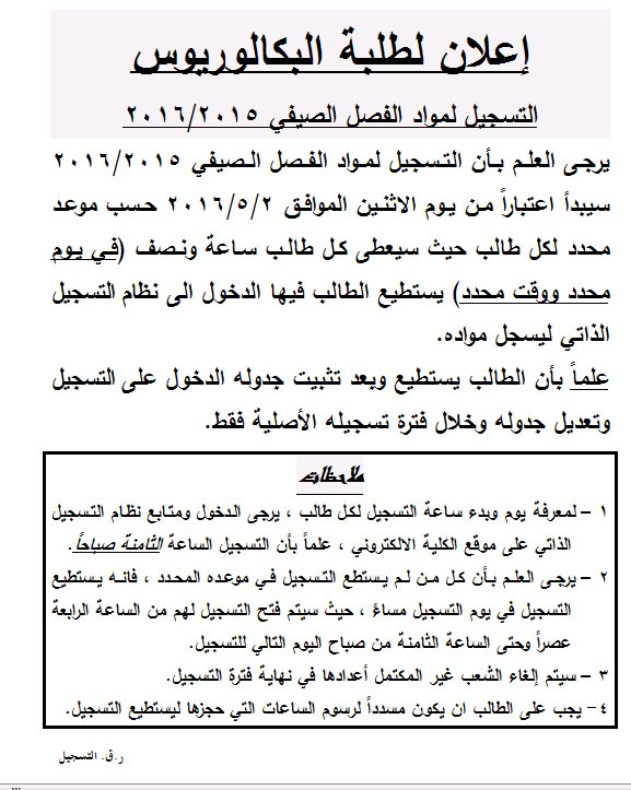 إعلان لطلبة البكالوريوس التسجيل لمواد الفصل الصيفي 2015/2016